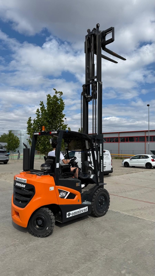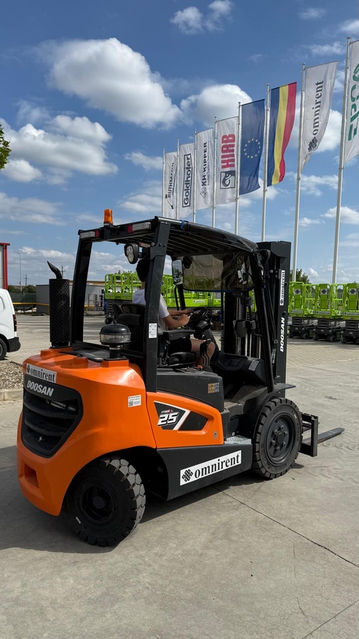 Motostivuitor Doosan diesel Stage V (DPF), 2.5to, 4.73m, catarg triplex, side shift, full free lift, frana electrica, lumini de lucru LED, 2024 demo, ISCIR, CE, manuale, anvelope pline