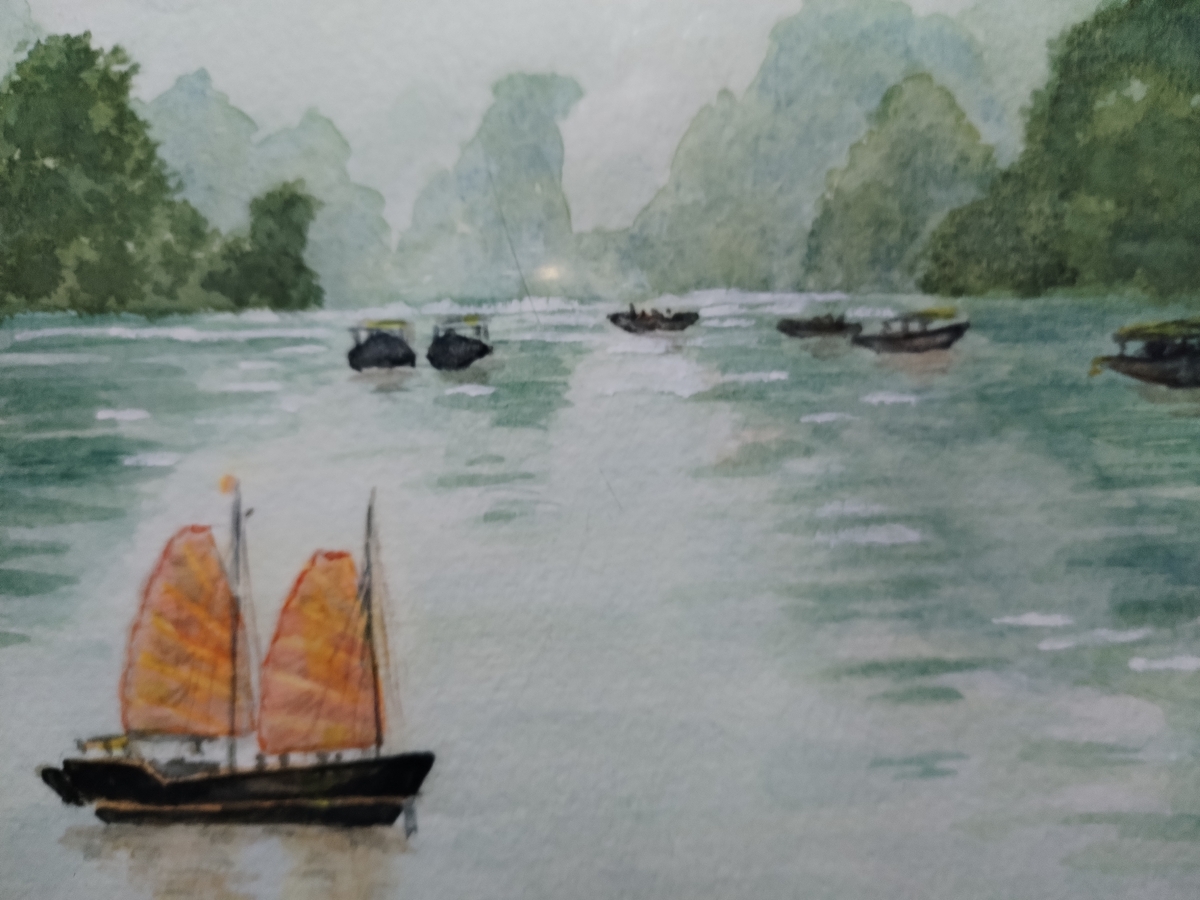 Lucrarea reda un peisaj marin linistit, cu barci cu vele si reliefuri verzi, pictat in tonuri delicate si transparente specifice tehnicii acuarelei.
