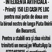 Pentru inceput vino la birou maxim doua ore si primesti pe loc 150 lei cash (numerar). Putem stabili ora si ziua vizitei daca trimiti mesaj (ATENTIE-NU SUNATI) pe WhatsApp la 0732493935 mentionand: AI