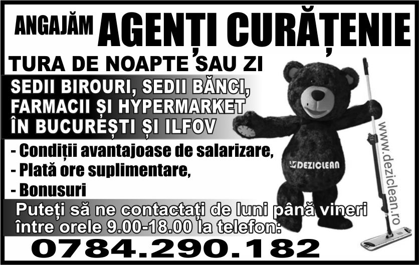 sediu birouri, sedii de banci, farmacii, supermarket Bucuresti si Ilfov. Conditii avantajoase de salarizare, plata ore suplimentare, bonusuri. Puteti sa ne contactati de luni pana vineri intre orele 9.00-18.00