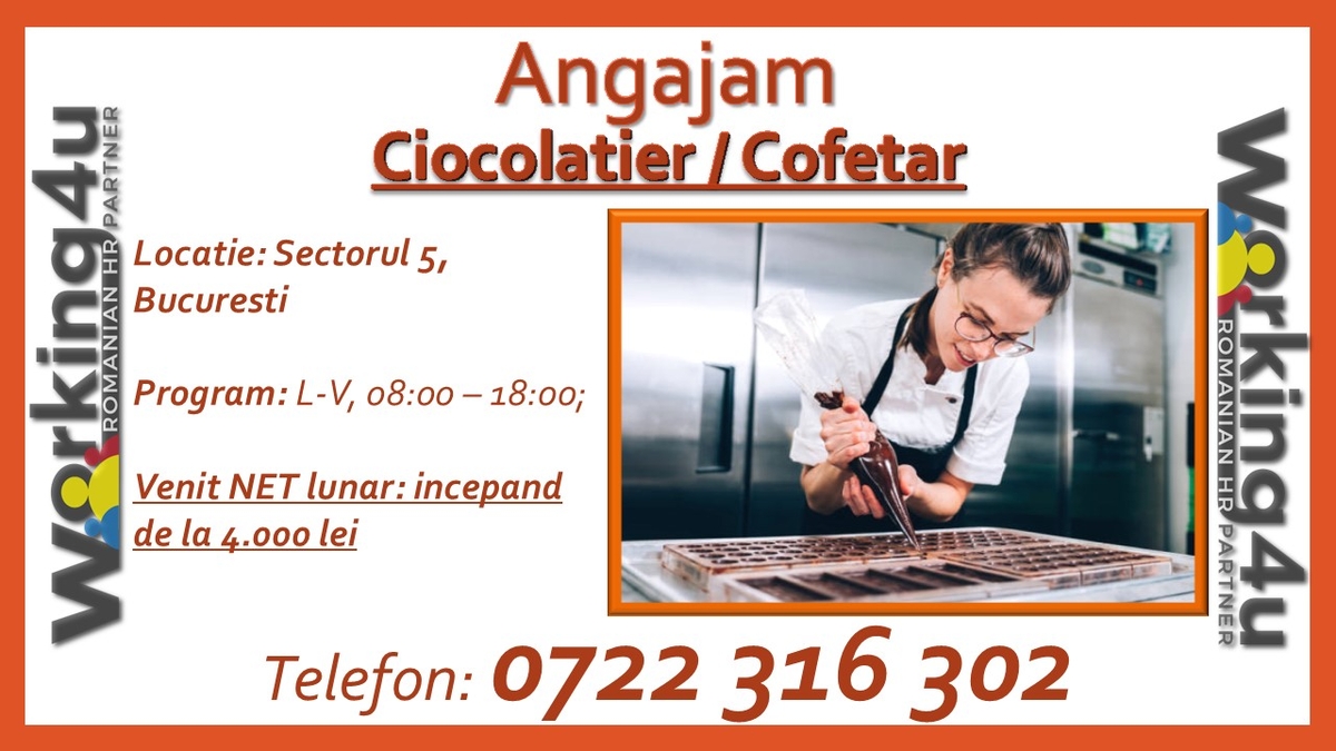 Pentru clientul nostru, atelier de ciocolata cu vechime in piata, situat in Sectorul 5, Bucuresti suntem in cautarea unui nou coleg pentru postul de Ciocolatier / Cofetar.