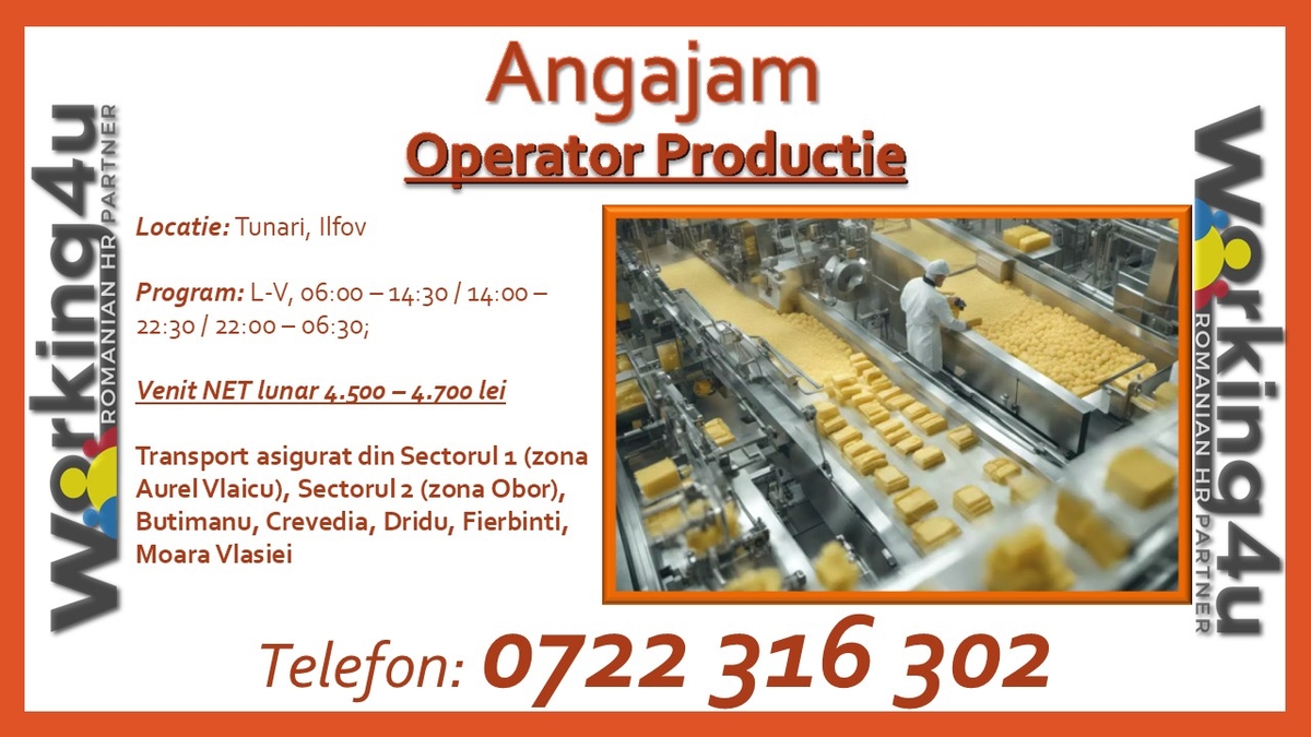 Pentru angajari, trimiteti CV-ul Dvs. pe adresa de e-mail recrutare@working4u.ro sau contactati-ne la numarul de telefon 0722 316 302.