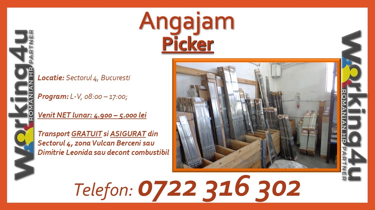 Pentru clientul nostru, companie specializata in distributia de balustrade, grilaje si fatade pentru cladiri, cu sediul situat in Sectorul 4, Bucuresti, suntem in cautare de noi colegi pentru postul de picker in depozit.