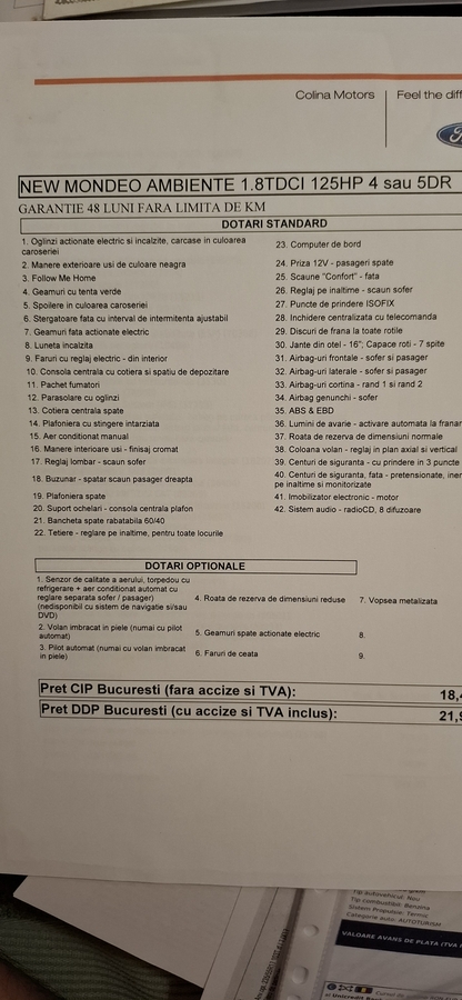 Optiuni confort: Geamuri electrice Oglinzi incalzite Aer conditionat Inchidere centralizata Comenzi volan Jante aliaj Pilot automat Senzori parcare Usi 4+1 Computer bord Oglinzi electrice Radio cd Sistem navigatie Volan reglabil