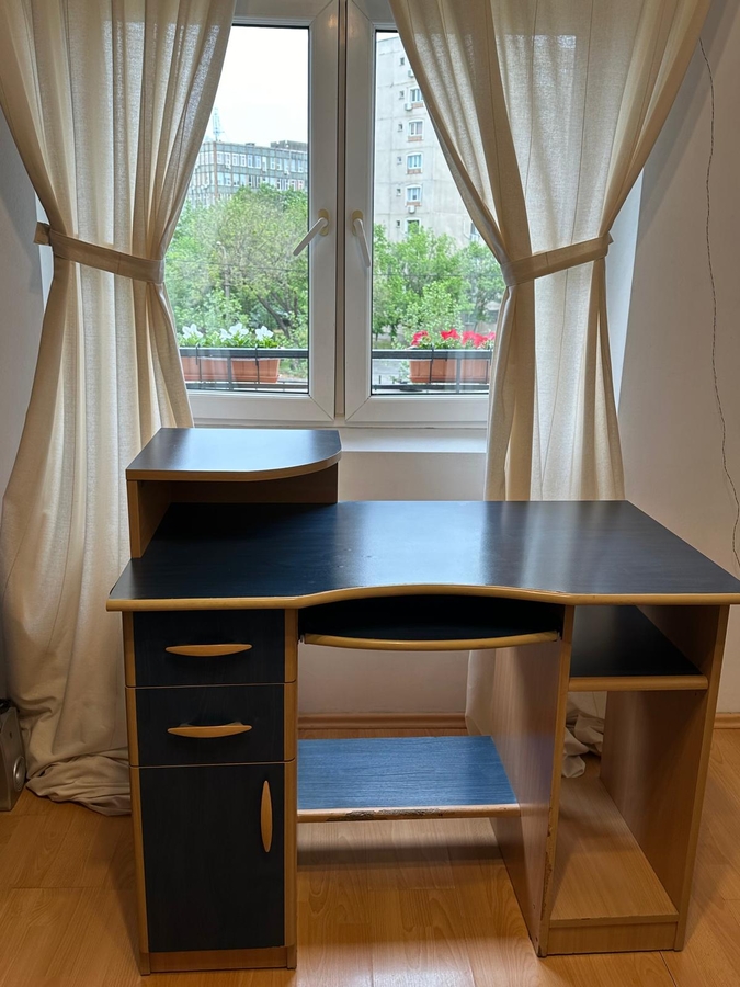Corpul cu sertare din partea stanga poate fi folosit pentru pastrarea diferitelor obiecte de birou sau chiar a dosarelor (in partea de jos), zona de depozitare inchisa cu usa.