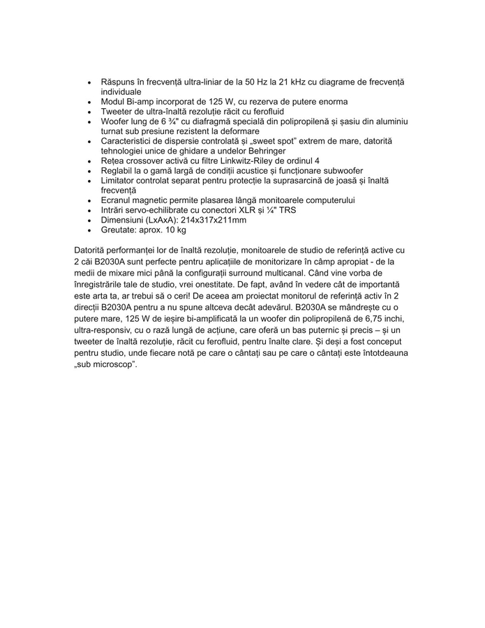 • Caracteristici de dispersie controlata si „sweet spot” extrem de mare, datorita tehnologiei unice de ghidare a undelor Behringer