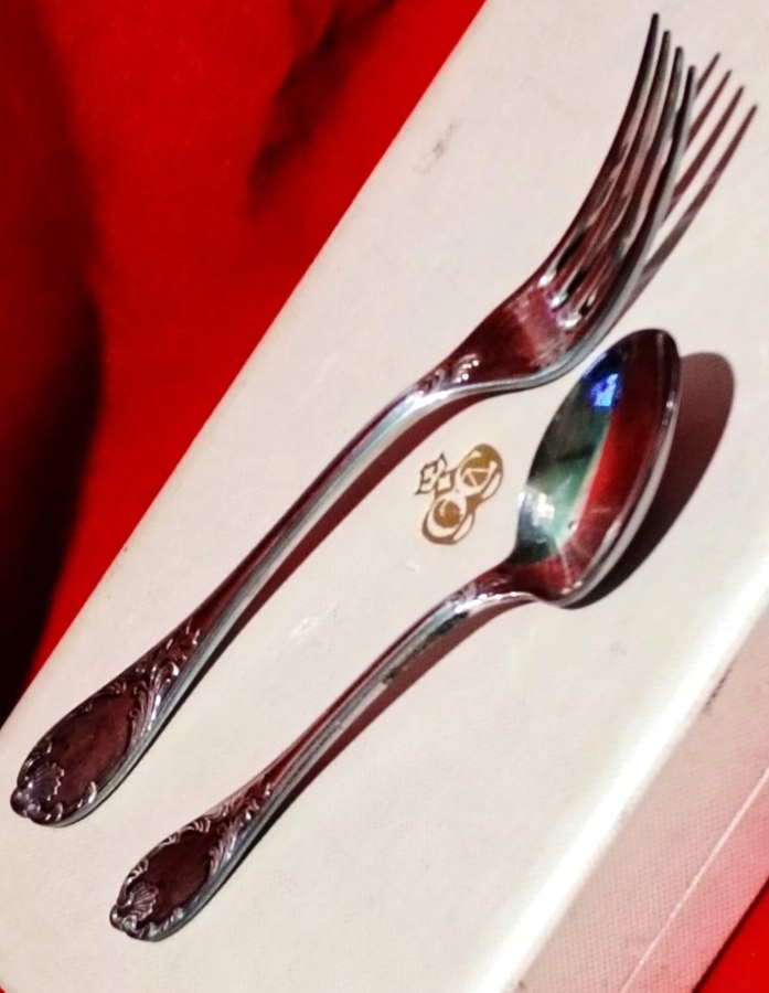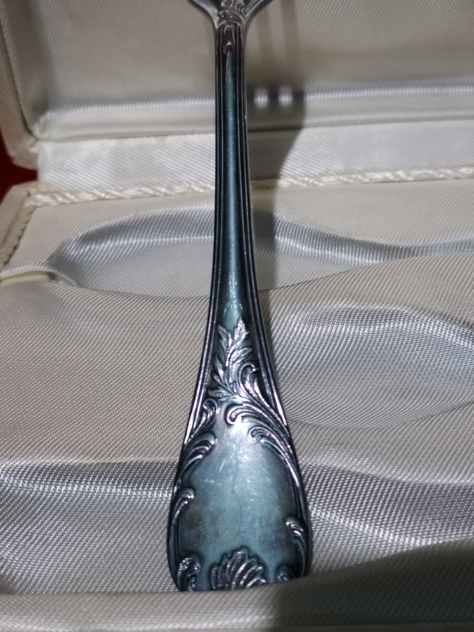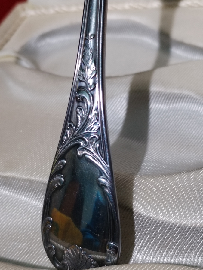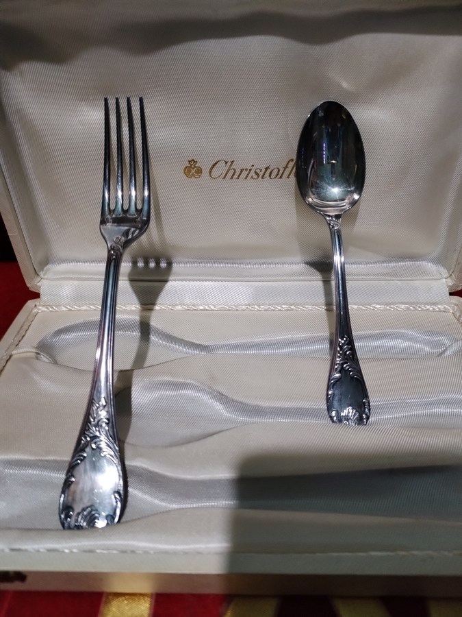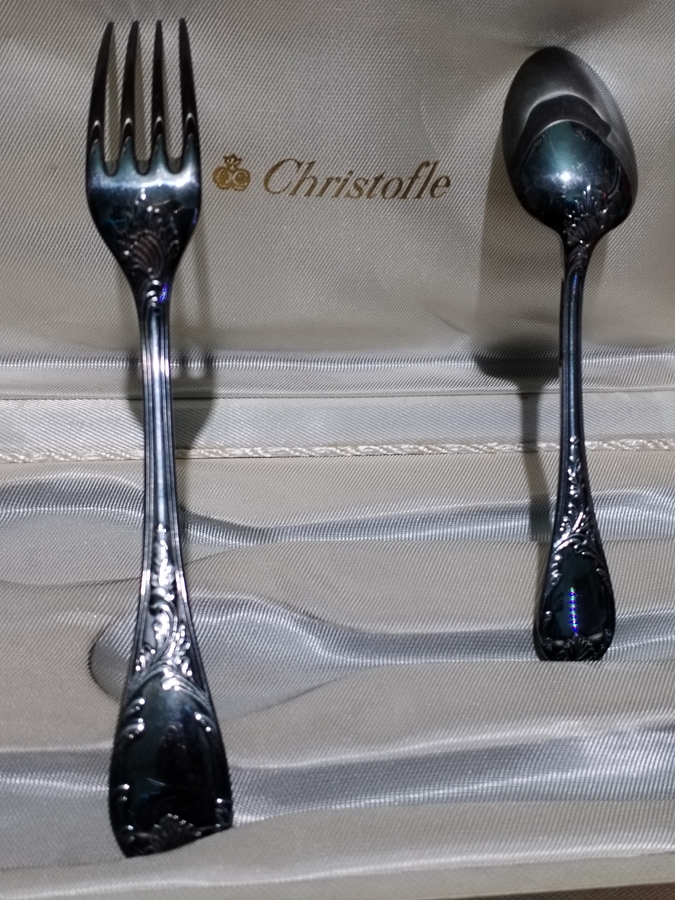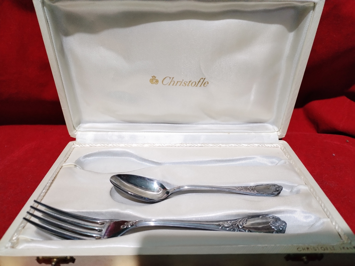Caseta cu furculita si lingurita Christofle, suflate cu argint.