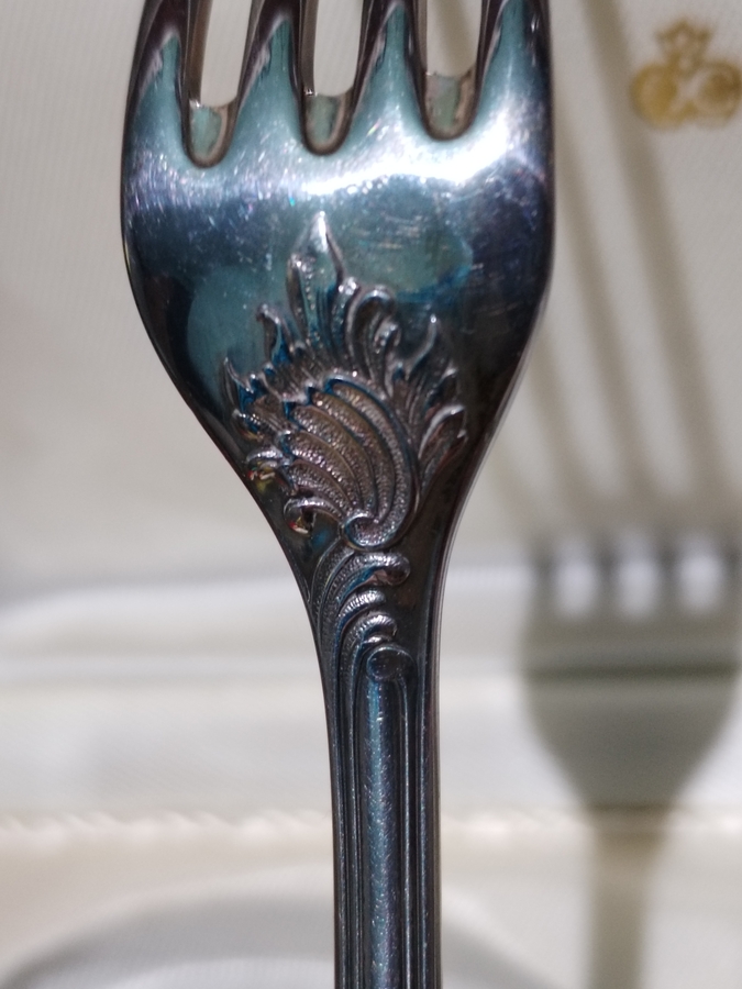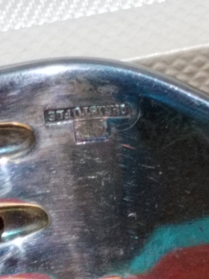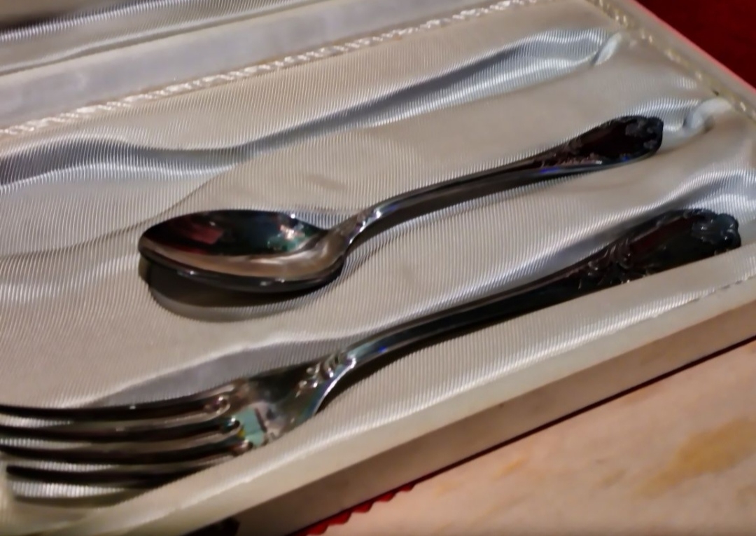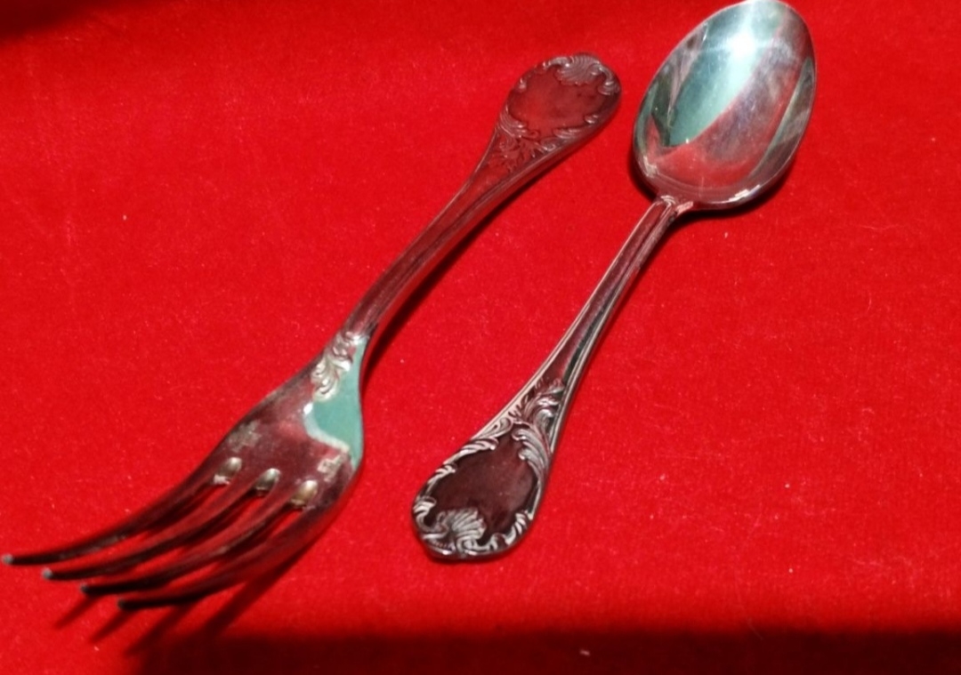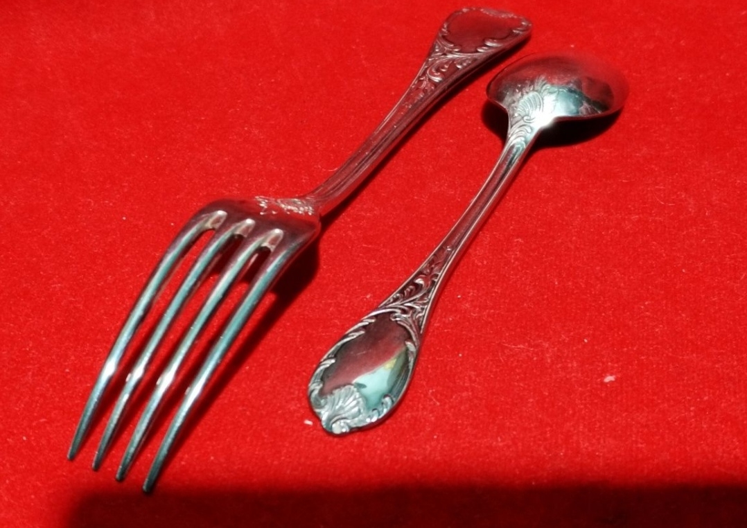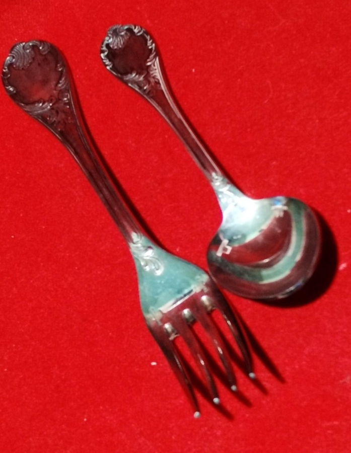 Caseta cu furculita si lingurita Christofle, suflate cu argint.