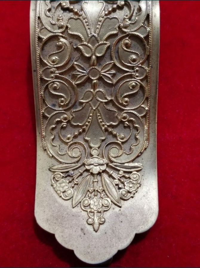 Partea frontala este decorata cu model bogat in detalii vegetale si volute ornamentale, caracteristice epocii victoriene.