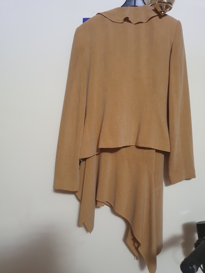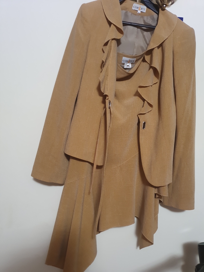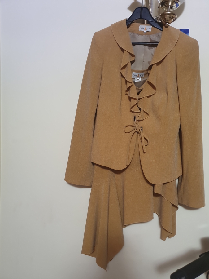 Compleu dama, culoare caramel, fusta si jacheta, volanase partile extreme, marimile 38 - 40.
