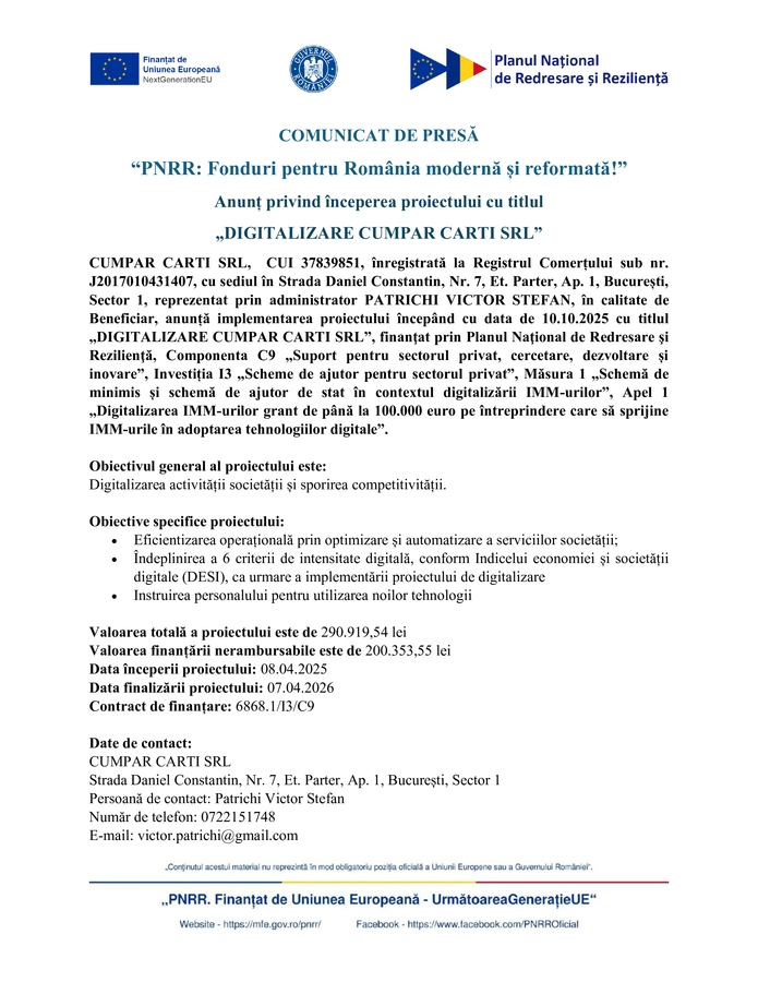 Anunt privind inceperea proiectului cu titlul Digitalizare Cumpar Carti SRL. Cumpar Carti SRL.CUI 37839851, inregistrata la Registrul Comertului sub nr. J2017010431407, cu sediul in Strada Daniel Constantin, Nr. 7, Et. Parter, Ap. 1, Bucuresti, Sector 1, reprezentat prin administrator Patrichi Victor Stefan, in calitate de Beneficiar, anunta implementarea proiectului incepand cu data de 10.10.2025 cu titlul Digitalizare Cumpar Carti SRL, finantat prin Planul National de Redresare si Rezilienta, Componenta C9 Suport pentru sectorul privat, cercetare, dezvoltare si inovare, Investitia I3 Scheme de ajutor pentru sectorul privat, Masura 1 Schema de minimis si schema de ajutor de stat in contextul digitalizarii IMM-urilor, Apel 1 Digitalizarea IMM-urilor grant de pana la 100.000 euro pe intreprindere care sa sprijine IMM-urile in adoptarea tehnologiilor digitale. Obiectivul general al proiectului este: Digitalizarea activitatii societatii si sporirea competitivitatii.