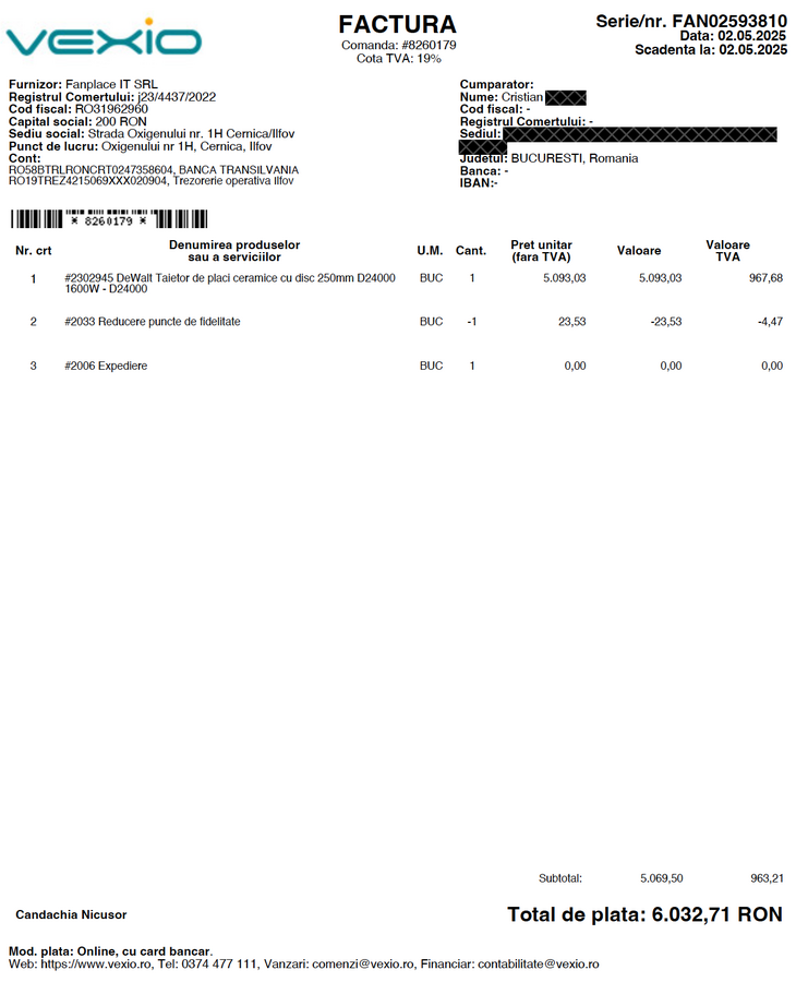 Masina de taiat in mediu umed cu disc diamantat Dewalt D24000, 1600 W, diametru disc 250 mm, pentru marmura, granit si placi ceramice. A fost achizitionata in data de 17-04-2025, insa nu a fost folosita. Nu ofer transport, se ridica direct de la noi. Pot atasa un video cu functionalitatea ei. Are garantie extinsa.