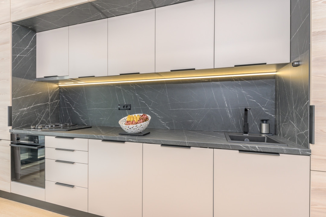 • Bucatarie deschisa, cu spatii generoase de depozitare, complet utilata cu aparatura Bosch -frigider cu congelator, masina de spalat vase, plita pe gaz, hota, cuptor electric, si Elecrolux -masina de spalat si uscat rufe, chiuveta cu baterie primagran);