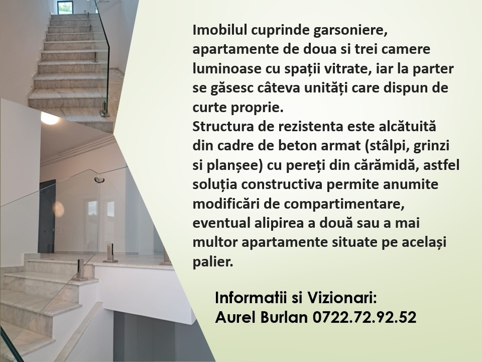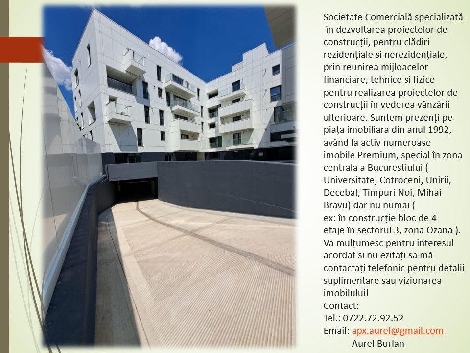 Imobil Premium - nou, S+P+4Etj, lift, cuprinde garsoniere, 2 si 3 camere, pretabil rezidential sau spatiu pt birouri, nemobilate sau mobilate si utilate integral, centrale termice individuale de apartament, prima inchiriere, strada linistita predominant cu vile, complexul imobiliar are acces privat, monitorizat video, fatada imobilului ventilata, izolatie termica si fonica clasa A, locatari civilizati, 5 minute pana la bulevardele Unirii sau Decebal, respectiv P-ta Alba Iulia, 10 min. pe jos pana la P-ta Muncii - Metrou, acces facil catre toate zonele capitalei.
