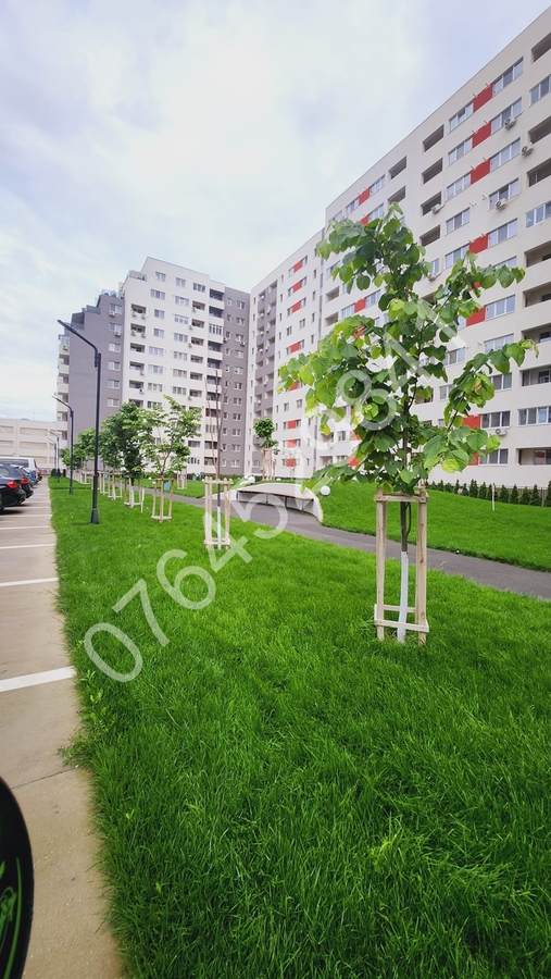 Parc cu alei inverzite in interiorul complexului realizat de arhitecti peisagisti,pomi,bancii, 2 locuri de joaca pentru copii cu suprafata tartan ,sistem de irigatie profesional cu aspersoare.