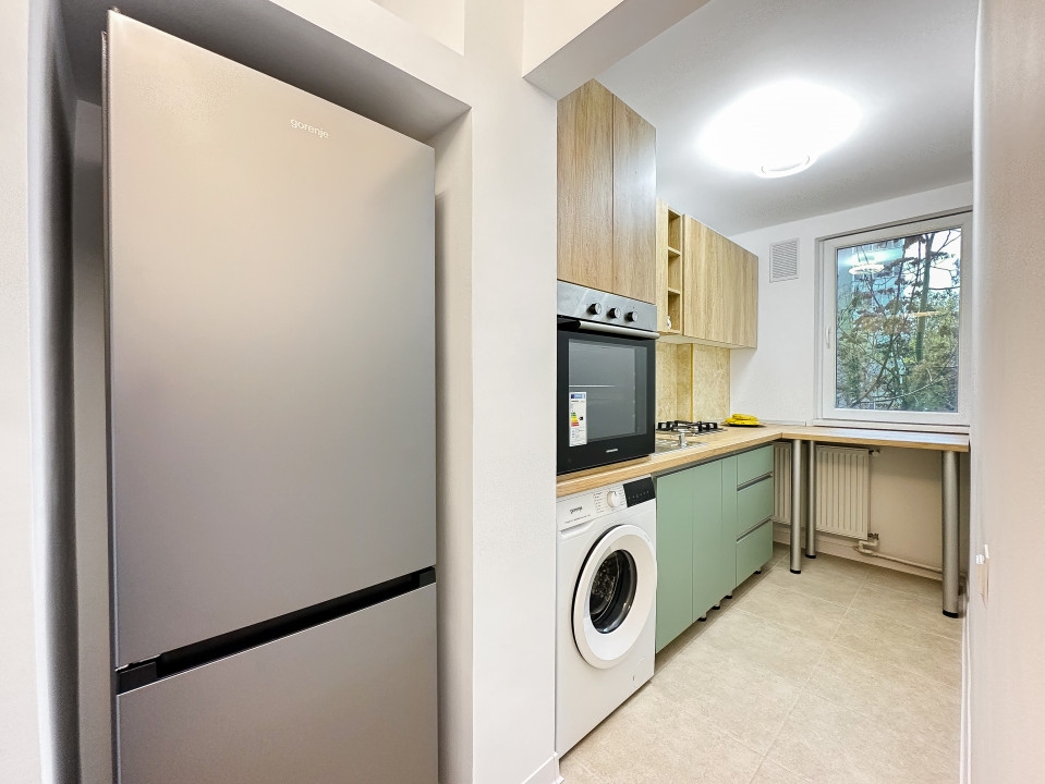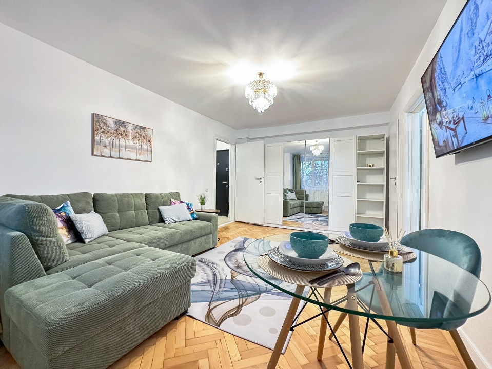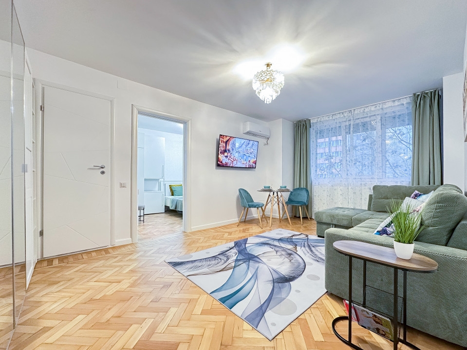 Apartament cu 2 camere mobilat si utilat coomplet. Este renovat integral (instalatii electrice noi, instalatii sanitare noi, mobila noua, tamplarie noua, electrocasnice noi etc.) fiind la prima inchiriere.