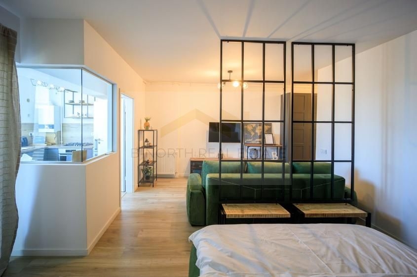 Compartimentarea este practica si include zona de living, zona de dormit, bucatarie complet echipata si baie dotata cu masina de spalat si uscator.