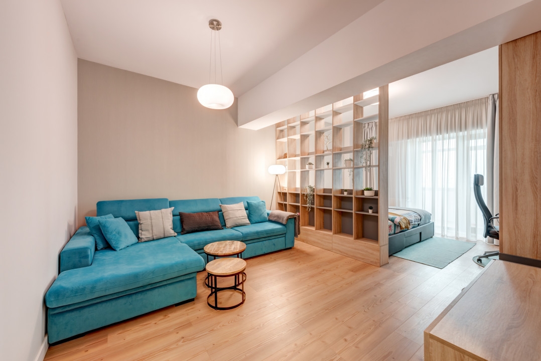 Camera, in suprafata de aproximativ 30 mp, a fost impartita in doua zone separate printr-o biblioteca/ etajera moderna. Zona de zi este amenajata cu o canapea extensibila, 2 masute de cafea, comoda si TV. Zona de dormit este amenajata cu pat matrimonial, dulap de haine si un birou cu scaun.