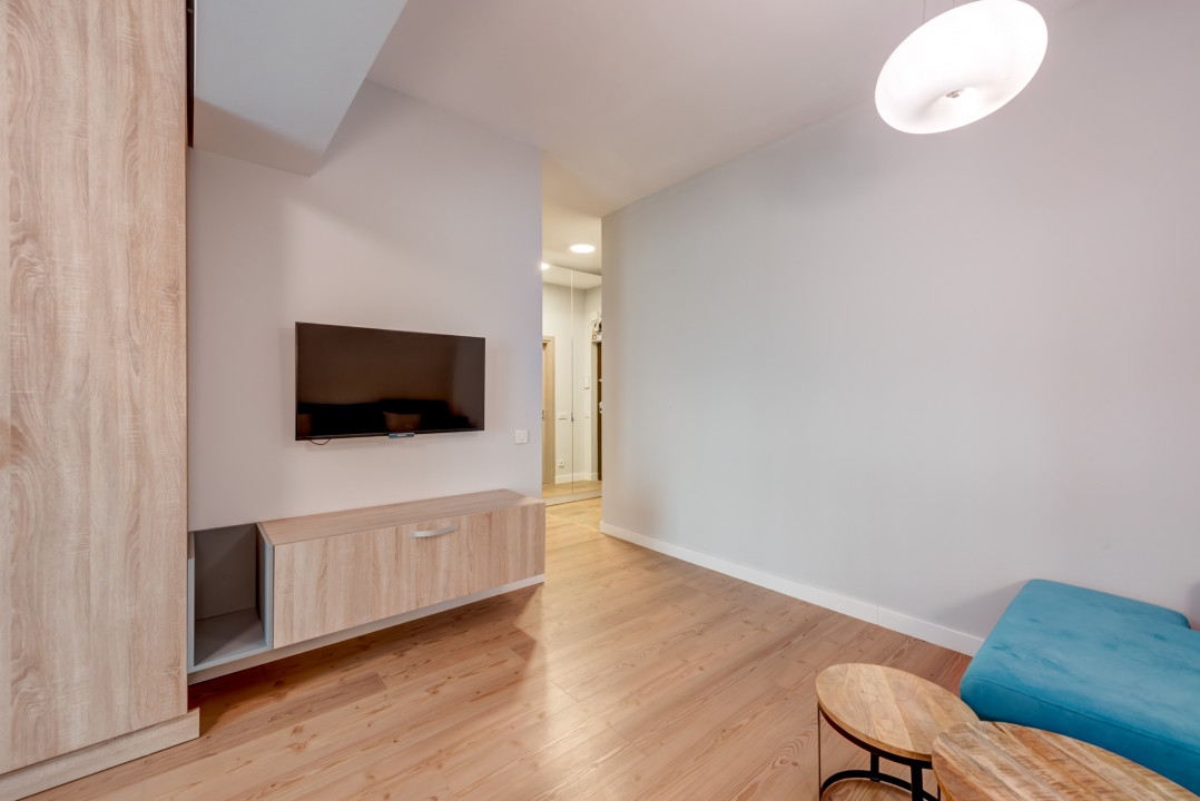 Compartimentarea este total decomandata, cu bucatarie inchisa, un hol generos la intrare cu spatii de depozitare, 1 baie spatioasa complet echipata, o camera amenajata cu zona de zi si zona de noapte si un balcon spatios cu acces atat din zona de bucatarie cat si din zona de zi.