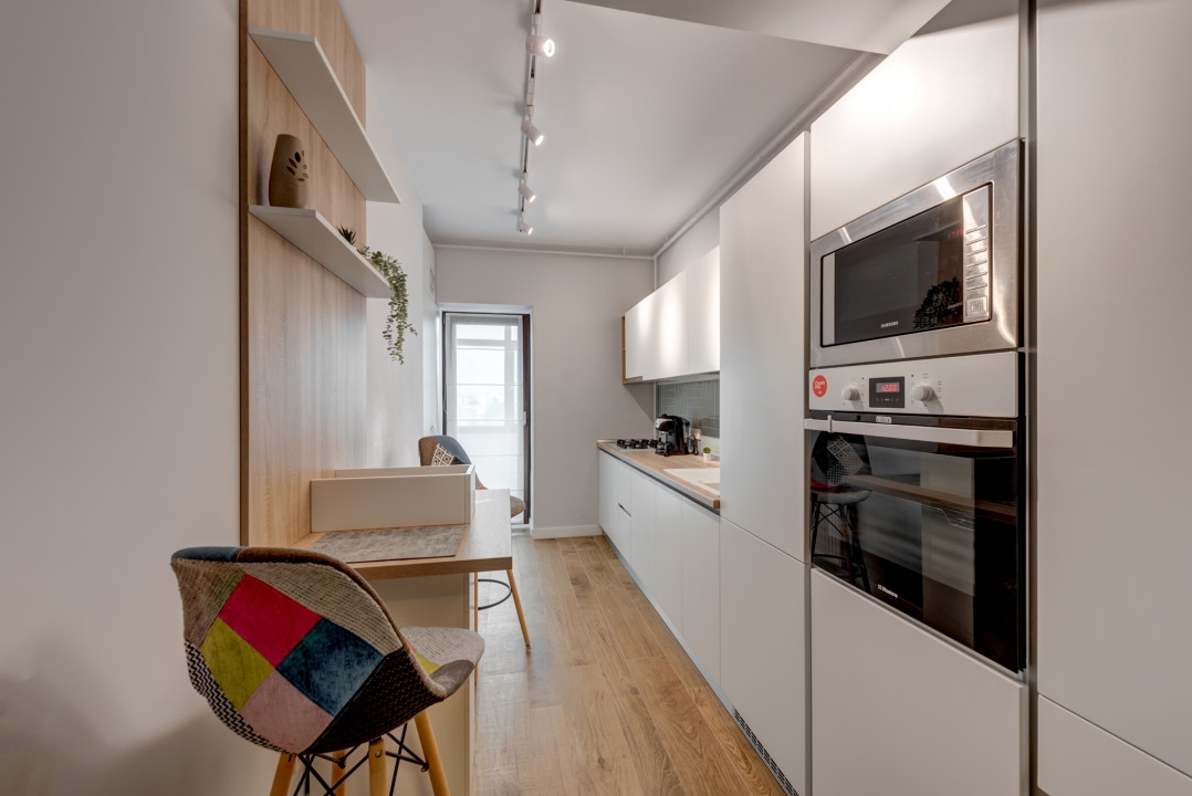 Bucataria este mobilata si utilata complet si are o suprafata de 12mp. Linia de bucatarie este extrem de generoasa cu multe spatii de depozitare si electrocasnice incorporate (frigider incorporat, plita, cuptor, hota, masina de spalat vase, cuptor cu microunde incorporat si masina de spalat rufe). Exista inclusiv espressor de cafea.