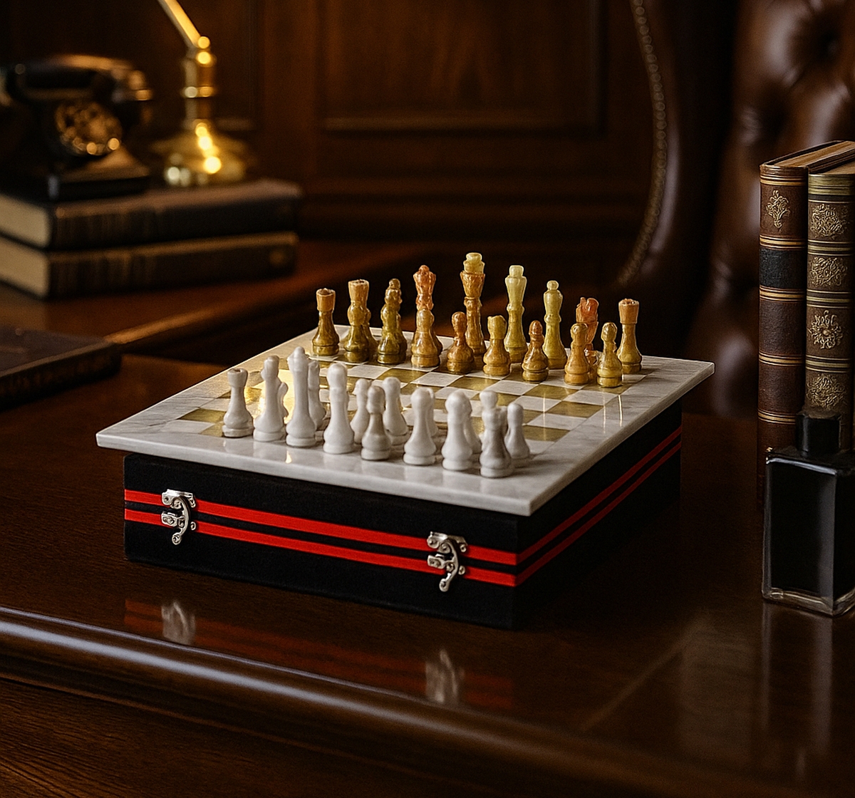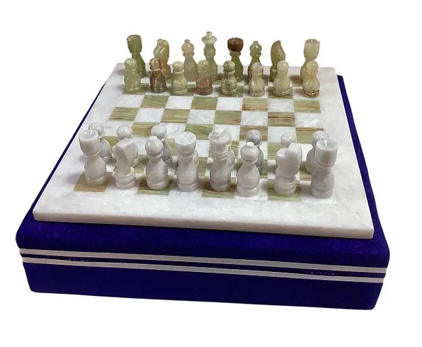 Onix Natural Autentic: Fiecare tabla de sah (dimensiune generoasa de 38x38 cm) este realizata din onix natural, cu venaturi si nuante unice, care ii ofera o frumusete aparte si o greutate specifica produselor de lux. Nu exista doua seturi identice!