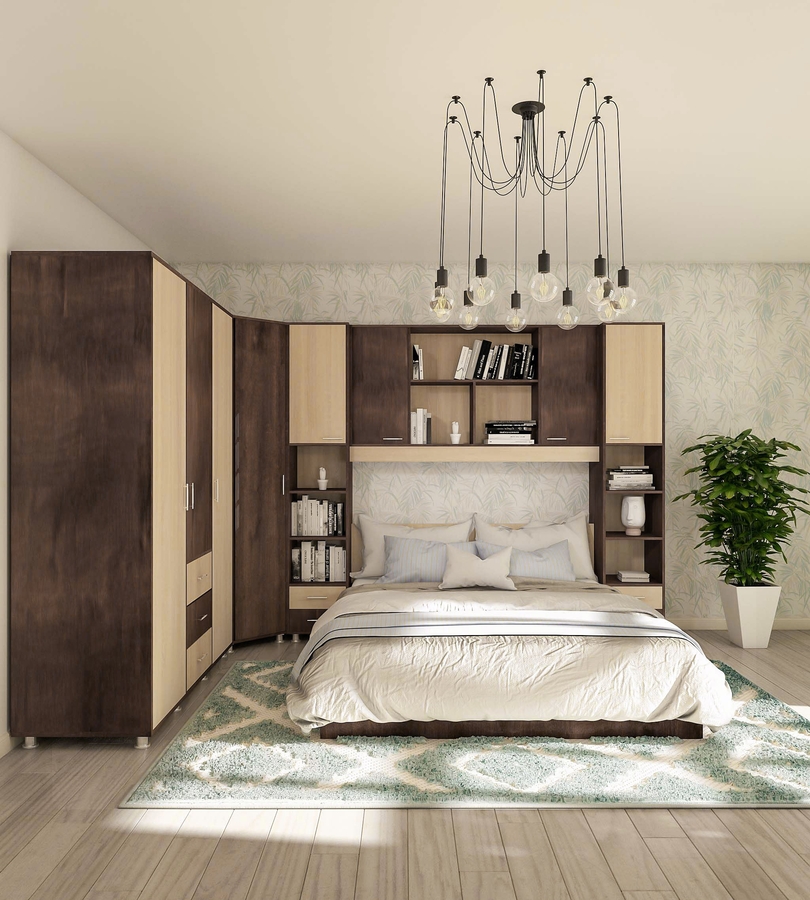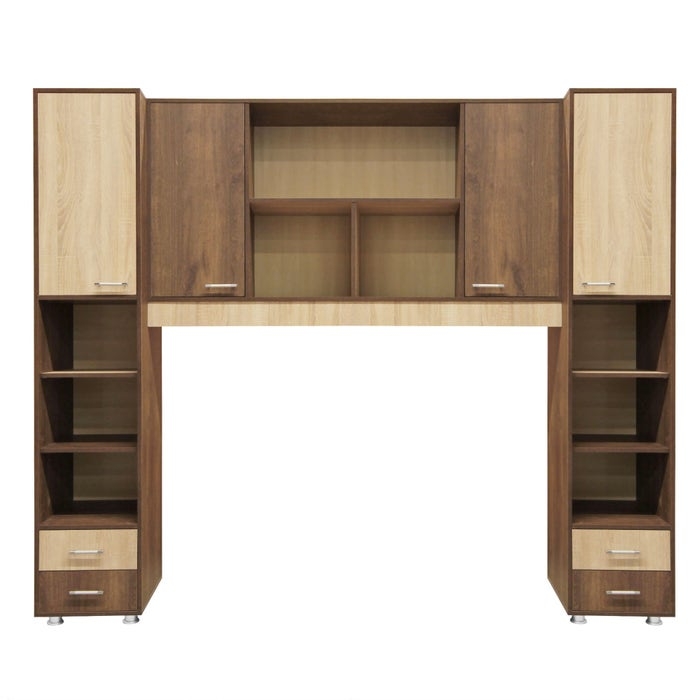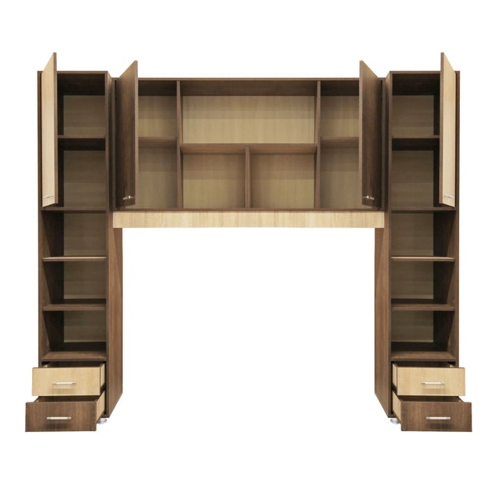 Corp suspendat deasupra patului, cu rafturi deschise si dulapuri inchise pentru organizare eficienta;