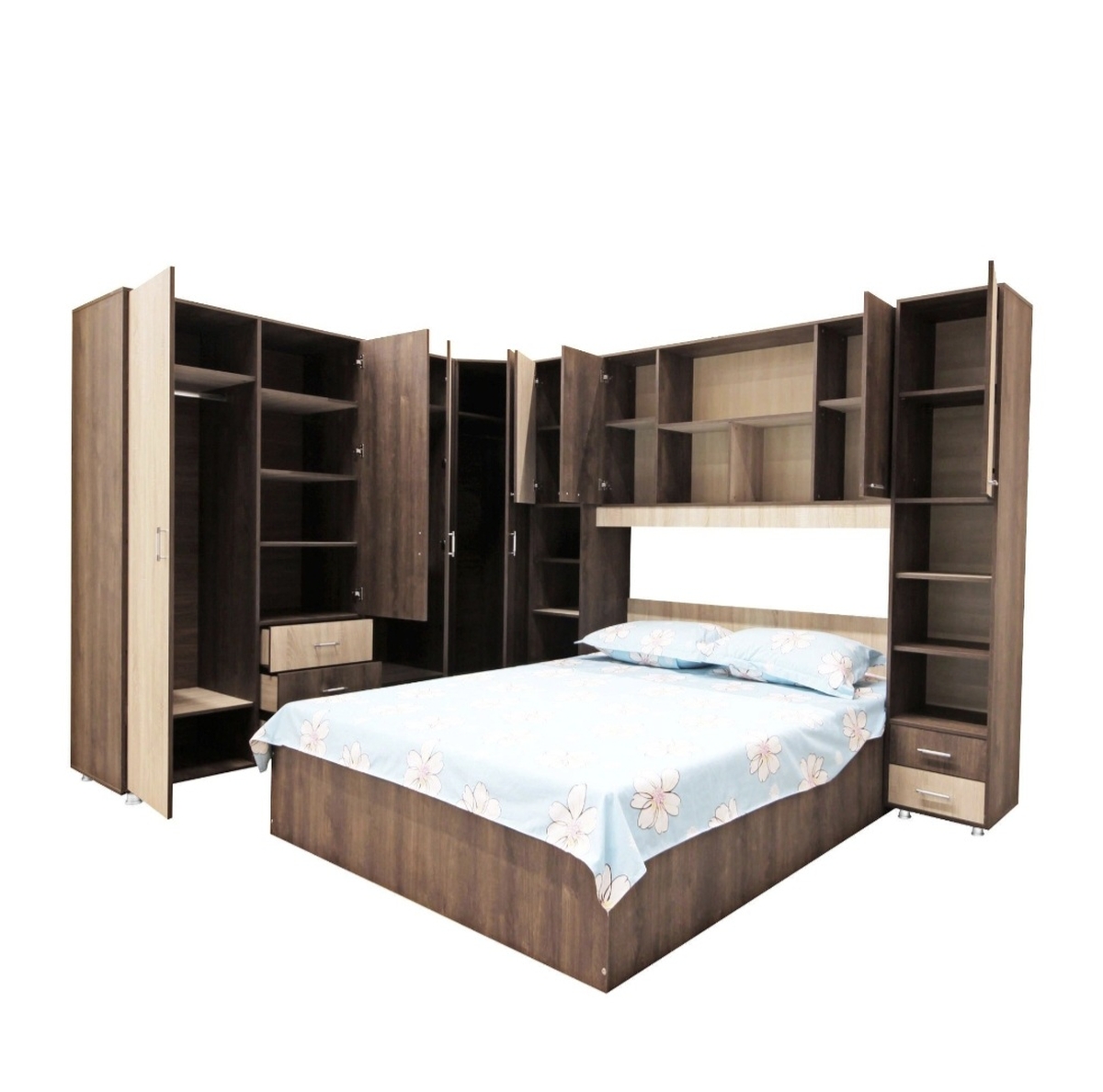 Mobila de dormitior pe colt Anda: sifonier, pat si ancadrament