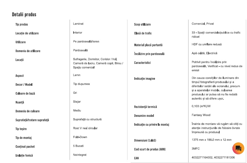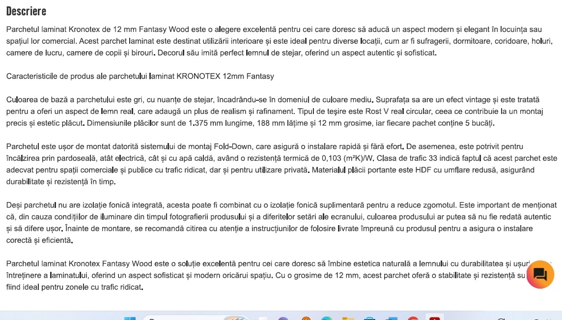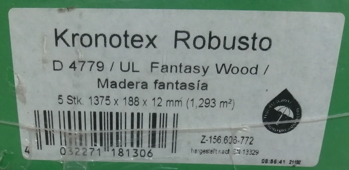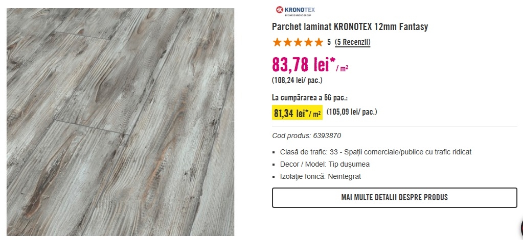 Vand 5.16 mp parchet laminat Germania, Kronotex Robusto model Fantasy Wood (D4779), grosime 12 mm, clasa de trafic 33 /AC5 (trafic foarte intens in spatii comerciale sau rezidentiale). Aspectul finisajului este foarte apropiat de cel din prezentarea facuta de Hornbach ( stejar gri - vezi foto atasata. Pentru edificare, pot oferi mostre de parchet). Montajul se face simplu (clic) fara sa necesite unelte speciale sau adezivi. Parchetul este nou, in ambalajul original (4 pachete x 1.29 mp fiecare). Oferta include 8.4 ml de plinta din MDF, asortata cu modelul parchetului (3 bucati x 2.80 ml / bucata).