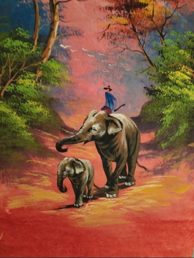 Design cu scene exotice si elefanti la apus, realizat in culori calde, vii, expresive.