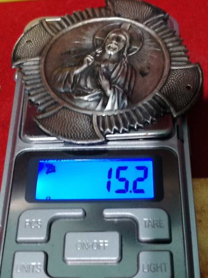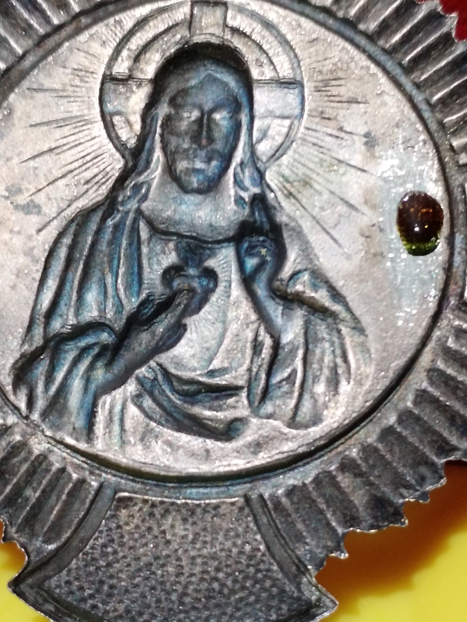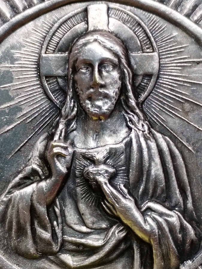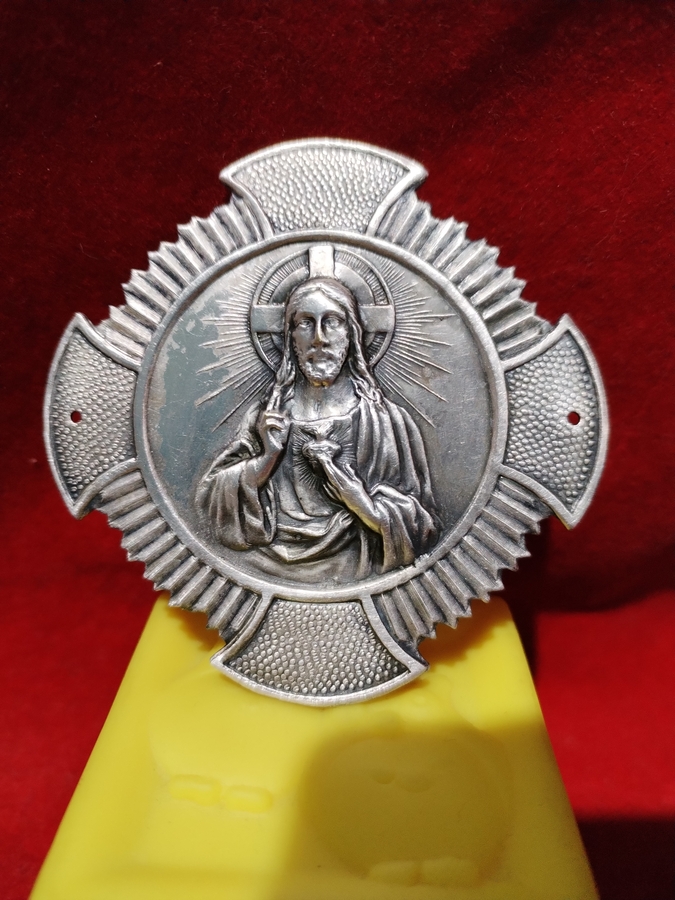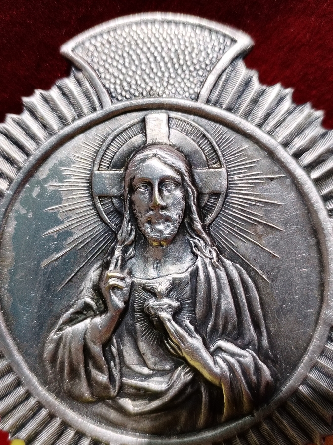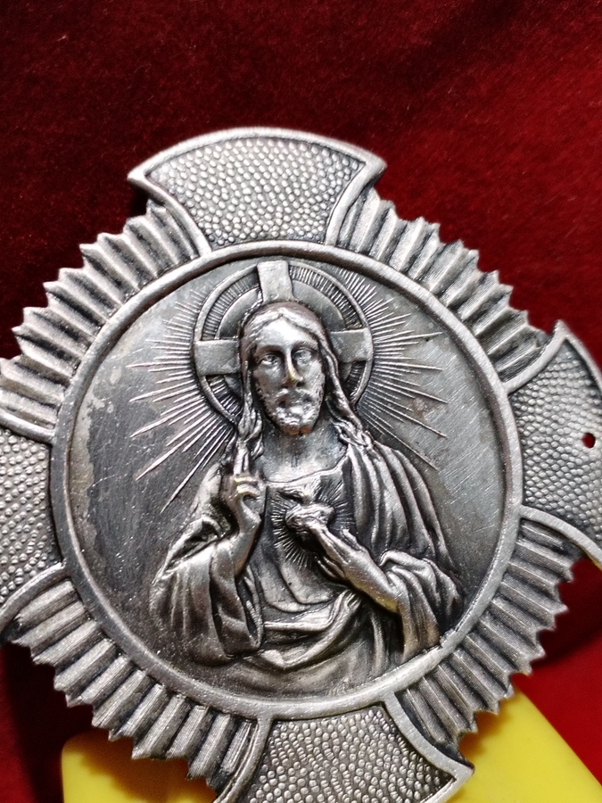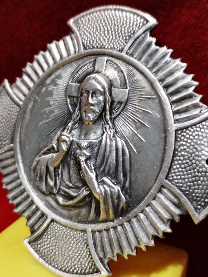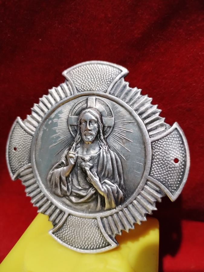 Piesa religioasa, reprezentand Inima Sacra a lui Isus Hristos, din metal argintat. Provenienta Franta anilor 1950 si folosit traditional de clasa mai instarita, ca placheta de usa, pentru binecuvantarea si protectia casei. Piesa autentica cu valoare istorica si spirituala. Greutate ca titlu informativ 15,2 gr. Dimensiuni 7,2 x 7,2 cm.