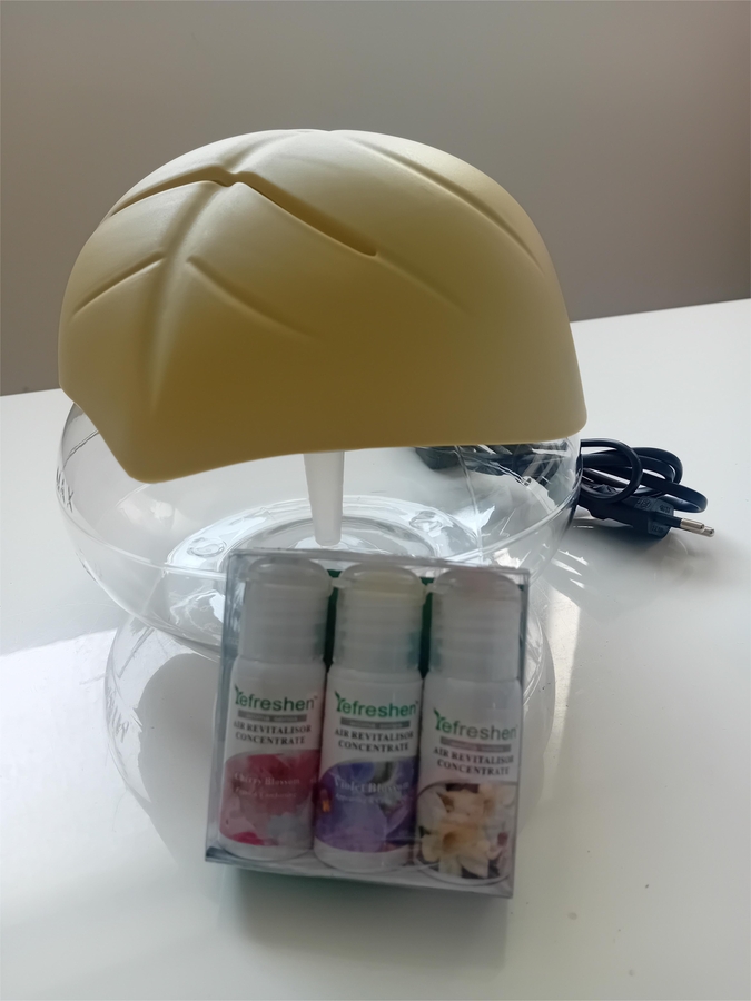 Mod de utilizare: In cuva aparatului se introduce aproximativ 1,5 l apa, se adauga cateva picaturi de ulei esential Refreshen, sau orice alt ulei esential, se pune capacul peste cuva aparatului si se cupleaza la priza. Aparatul are incorporat o lumina ambientala de culoare albastra, relaxanta. Datorita barbotarii apei, aparatul Refreshen produce ioni negativi, benefici organismului.
