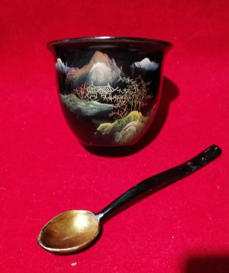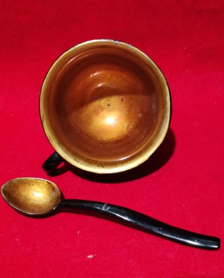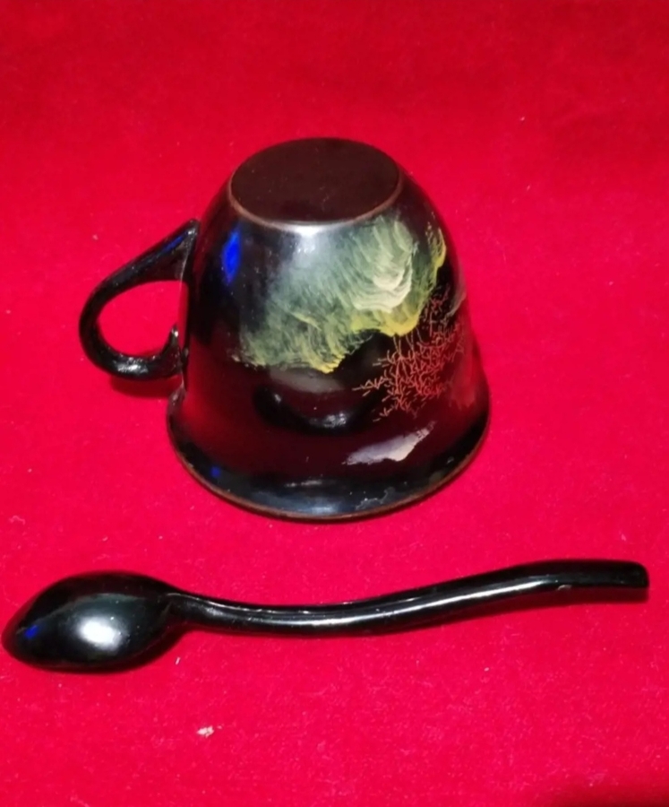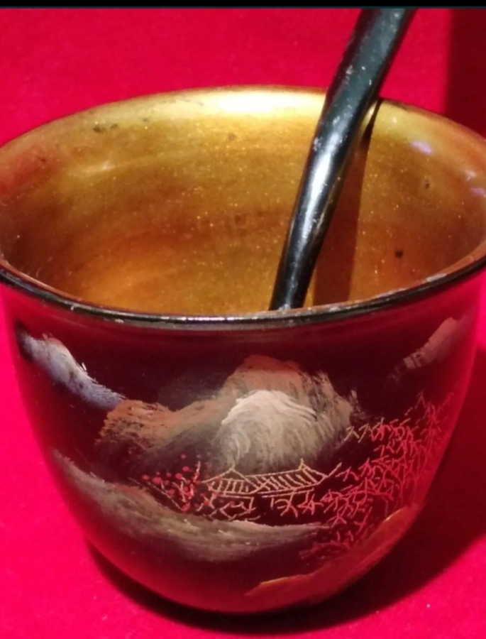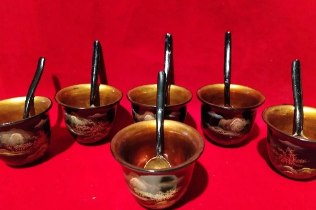 Set format din 6 cesti si 6 linguri din lemn foarte usor, tei japonez sau cedru, decorate in stil japonez traditional, cu lac negru si pictura aurie in culori, in tehnica Maki-e, cu pulbere de aur si argint.
