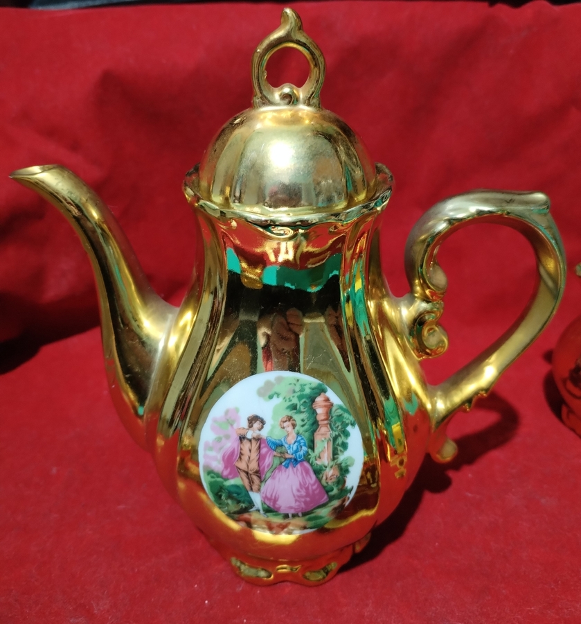 Contine, un ceainic cu capac, o zaharnita, o fristiera si 4 cesti aurite interior si exterior.