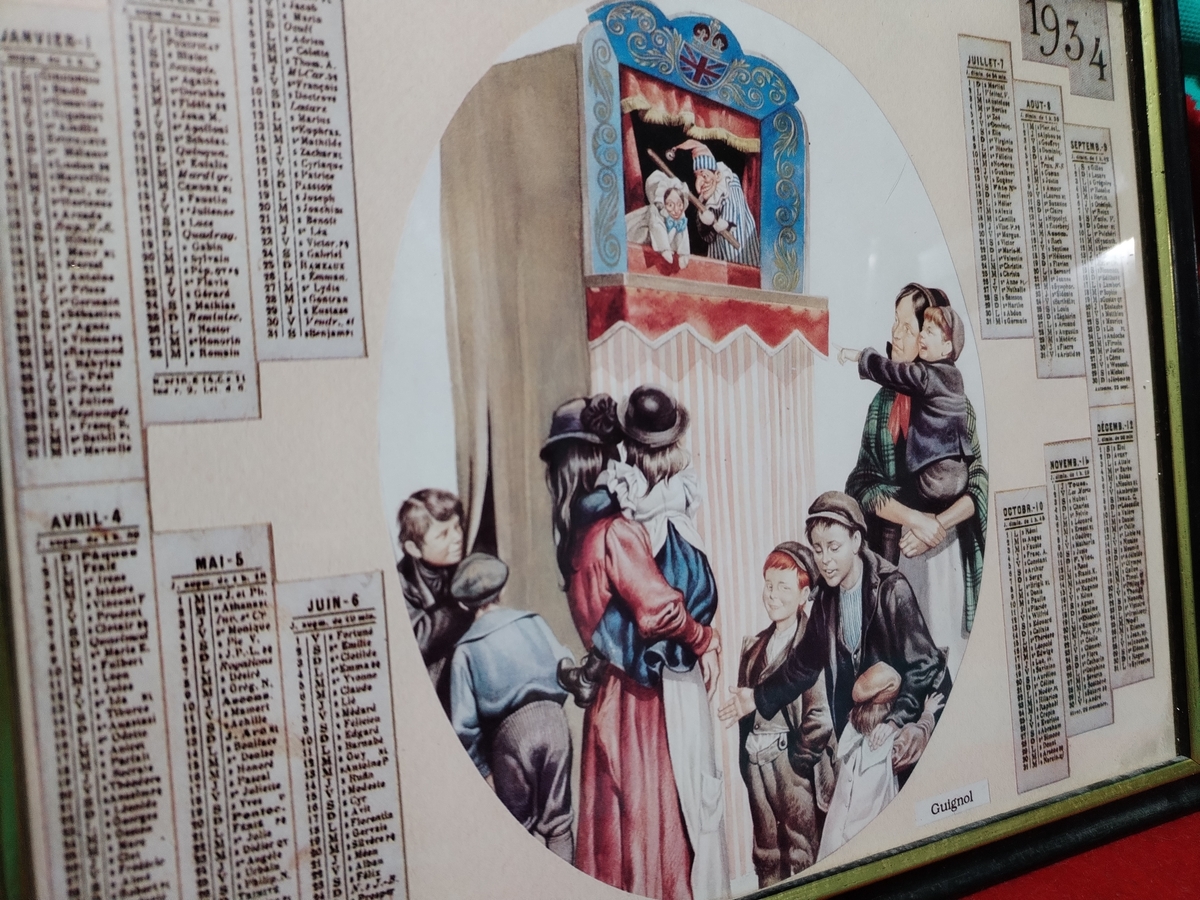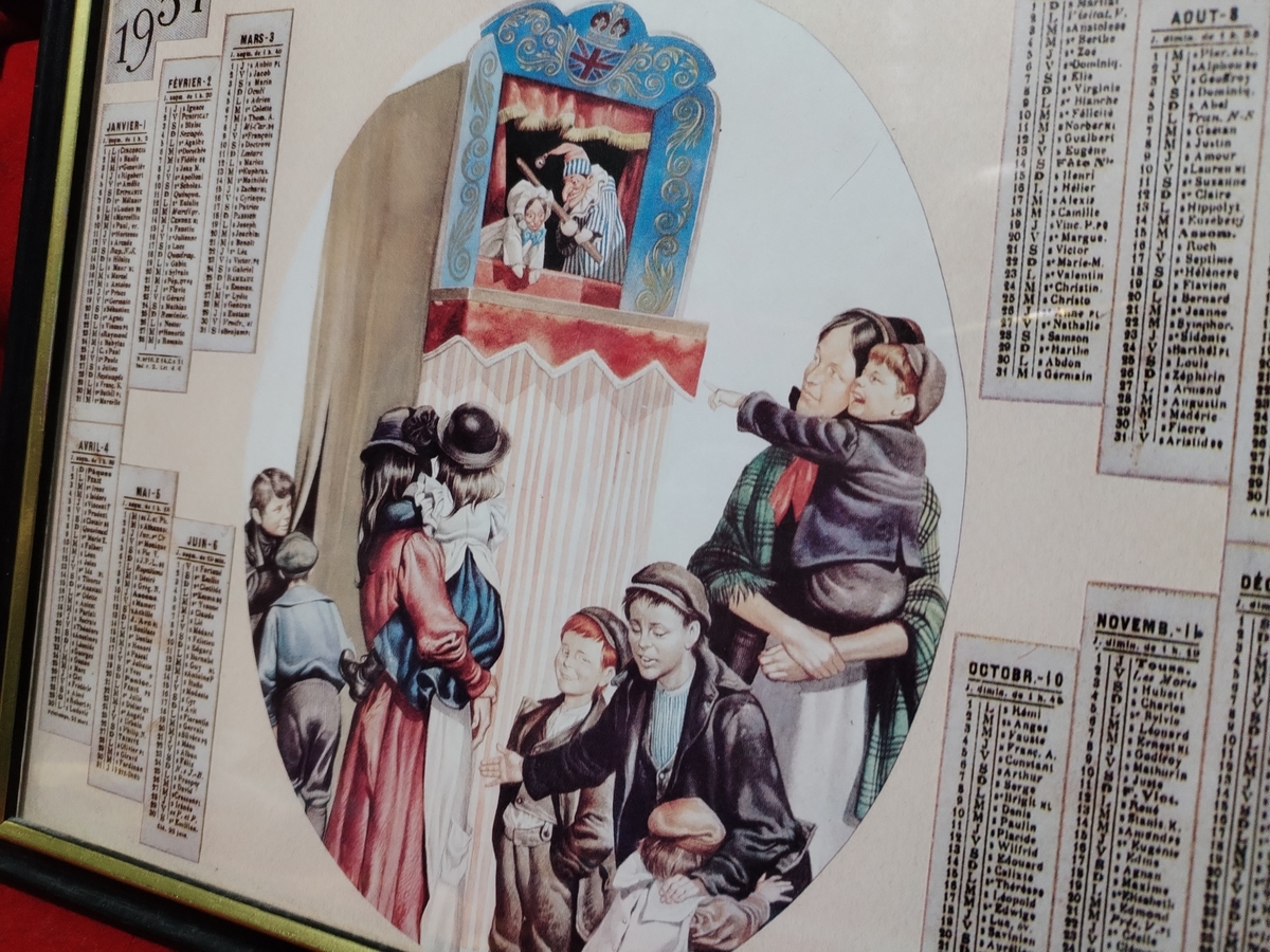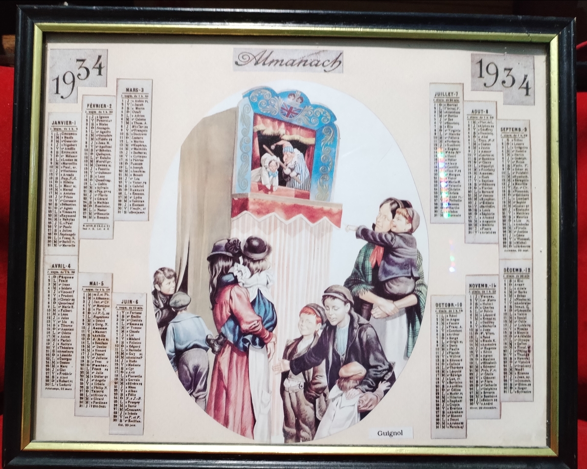 Tablou calendar Almanach 1934, cu teatrul de papusi.