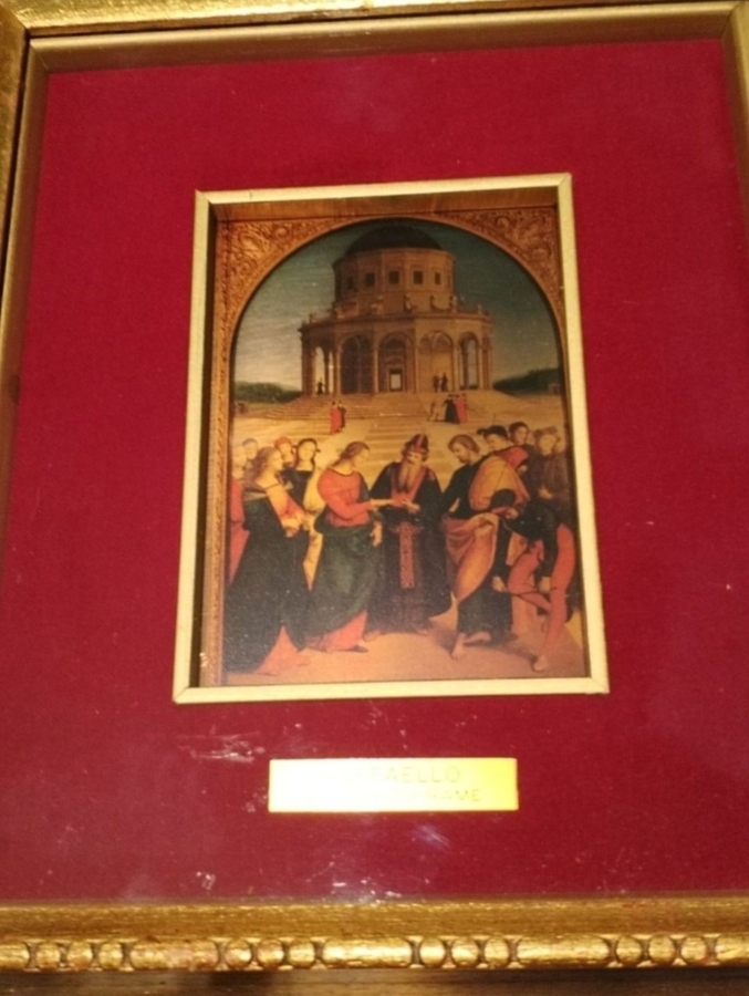 Vechi tablou litografie Raffaello cu Nunta Fecioarei.