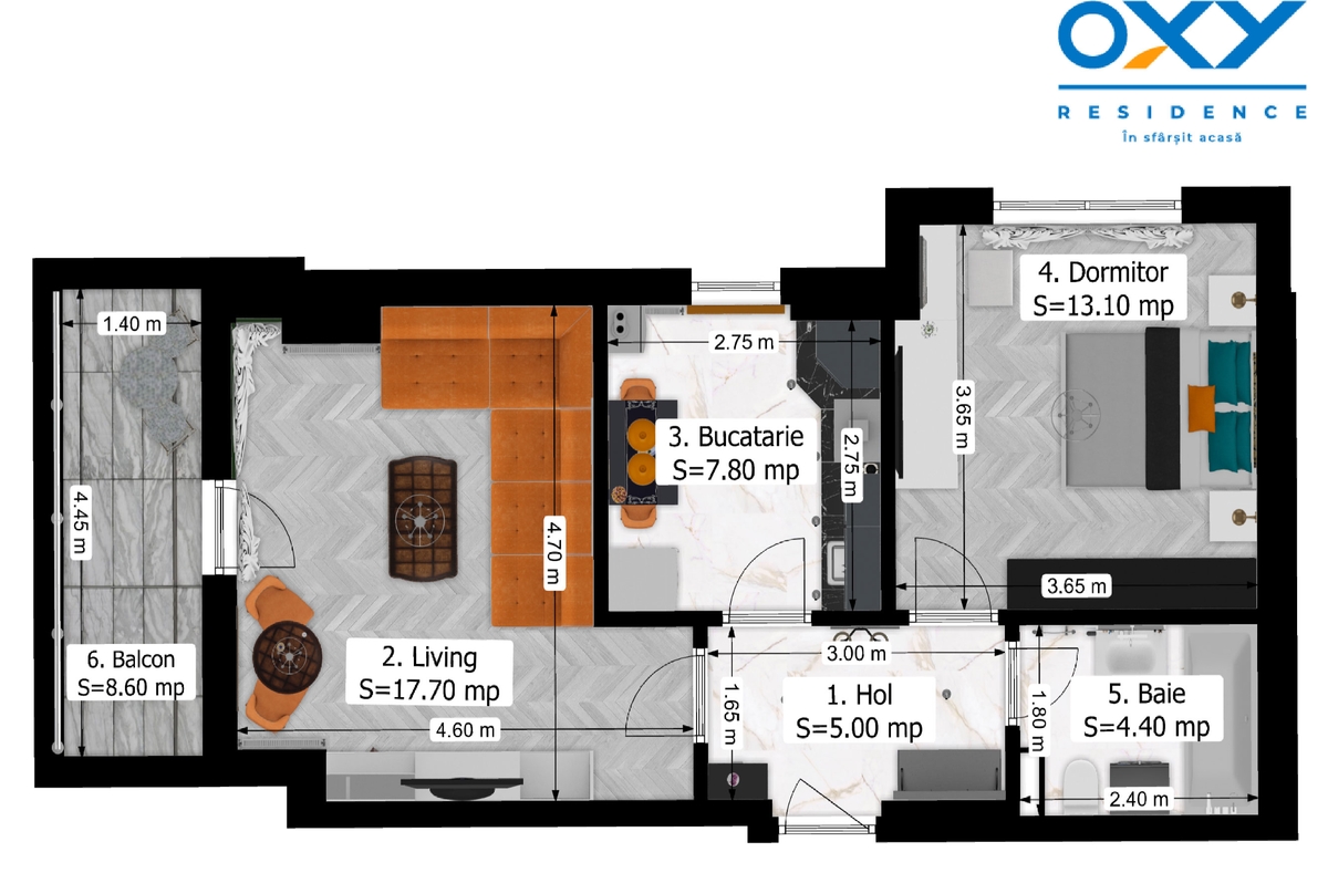 Apartamentul cu 2 camere Tip A, face parte din ansamblul rezidential Oxy Residence 2, situat la 20 de minute de Piata Unirii, in cartierul Bucurestean Rahova, pe Sos. Bucuresti-Magurele nr. 82W (chiar in statia STB Slatina), Sector 5, avand o suprafata total utila de 56.60 mp, fiind compus din hol-5.00 mp, living-17.70 mp, bucatarie-7.80 mp, dormitor 13.10 mp, baie-4.40 mp si balcon-8.60 mp.