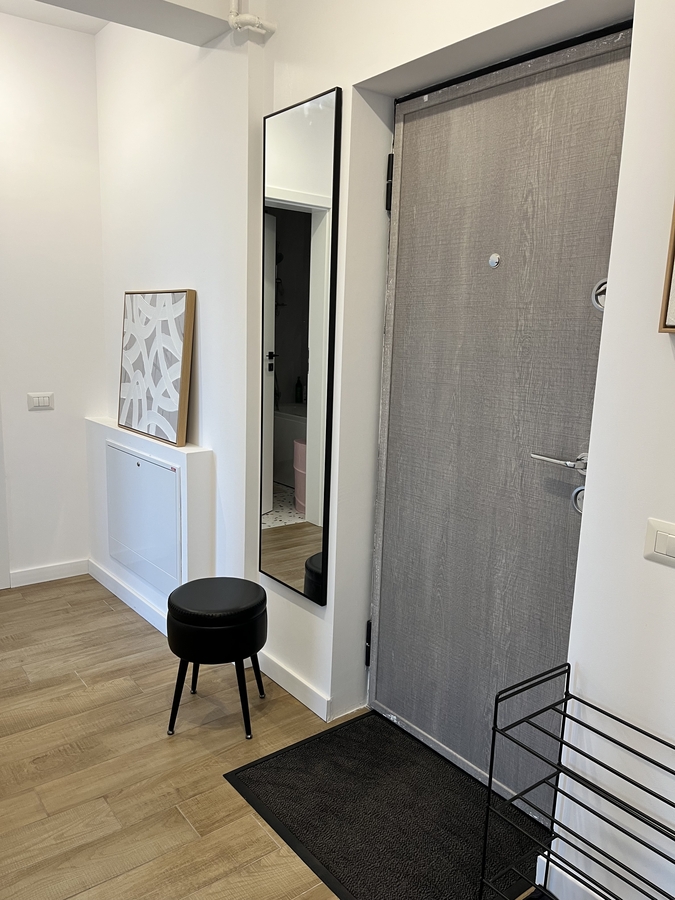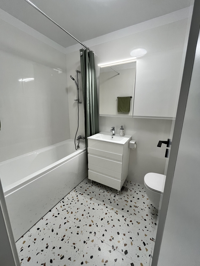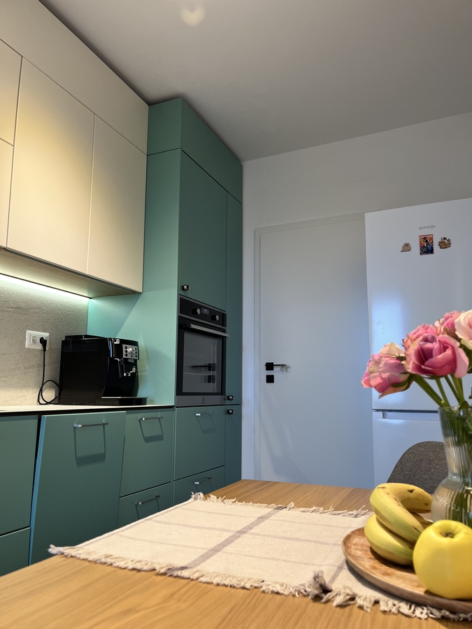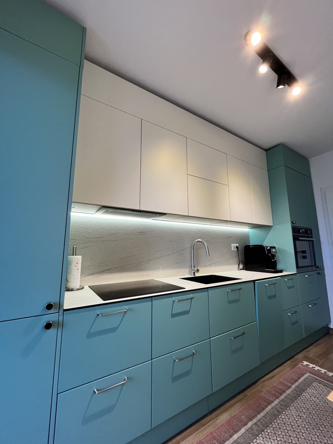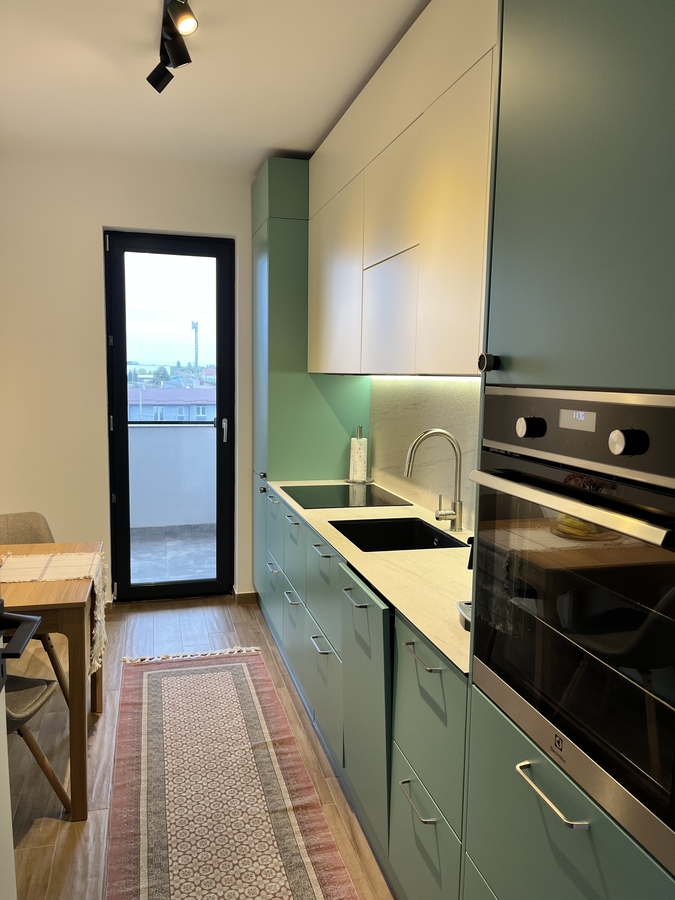 Finisaje medii spre lux, parchet Egger 10 mm, gresie si faianta Keros. Bucatarie pe comanda din MDF vopsit, feronerie Blum.