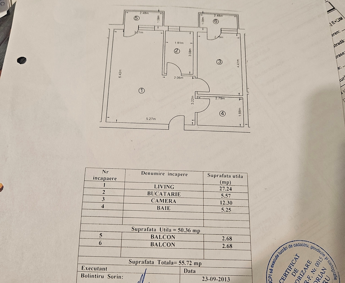 ap. 2 camere aflat pe Luica intersectie cu Brancoveanu, in bloc 2013, usor retras, etaj 2/5, confort 1, 55,72 mp cu doua balcoane inchise PVC - releveu atasat