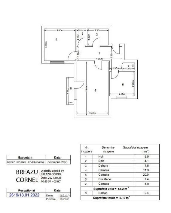 Alcatuita dintr-o camera si dependinte, tip garsoniera decomandat, suprafata utila 55 mp, suprafata construita 60 mp.