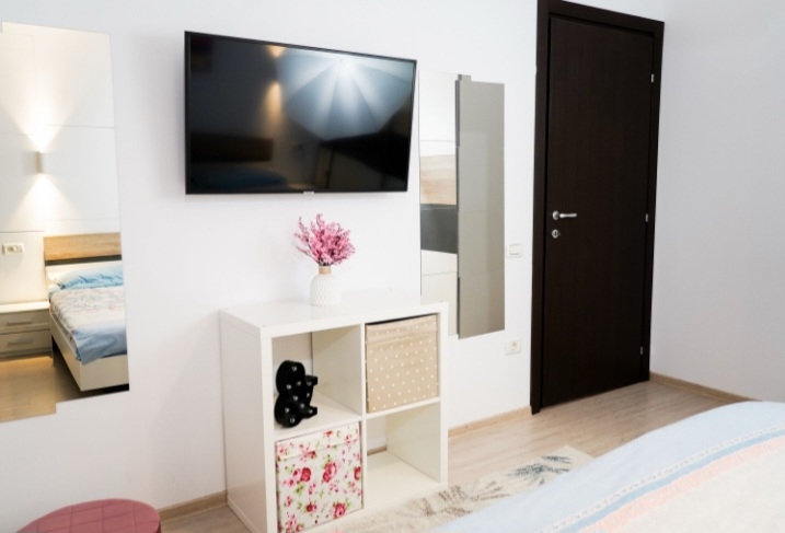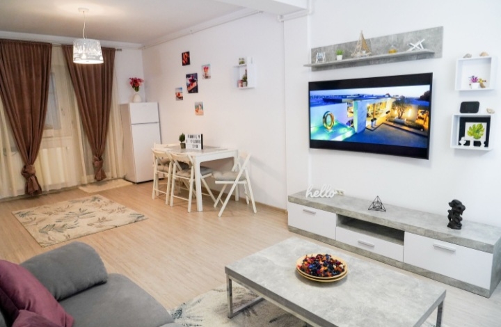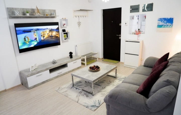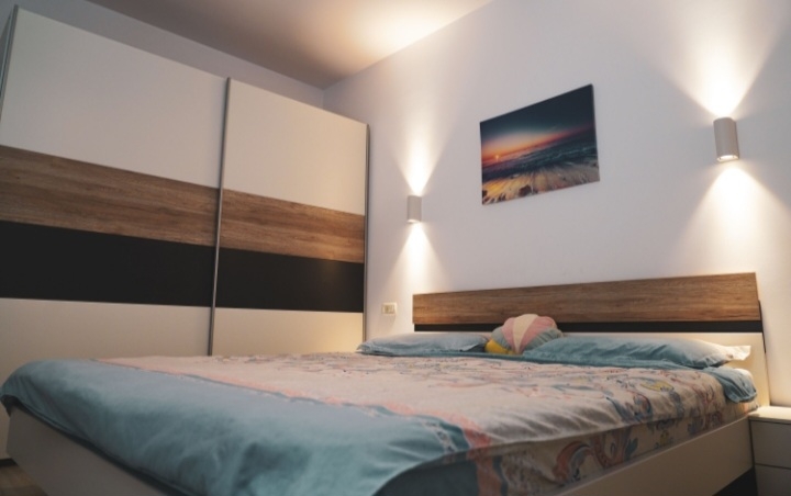 Apartament 2 camere semidecomandat, baie, bucatarie si un balcon prevazut cu geamuri glisante, amenajat pentru petrecerea timpului si relaxare.