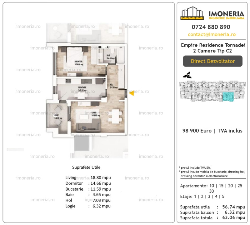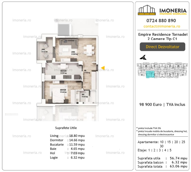 Apartamentele cu 2 camere din imobilul Empire Residene Tornadei vor fi cu siguranta in topul preferintelor tale!