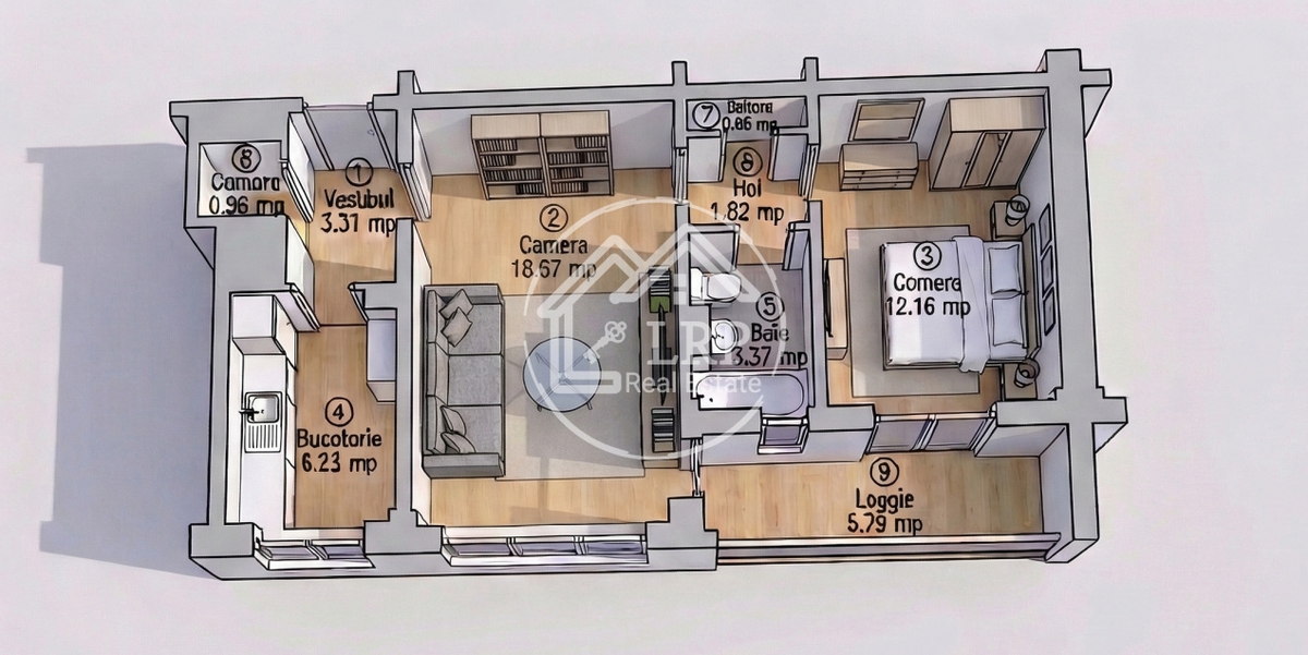 Suprafata: 53 mp utili, avand o compartimentare semidecomandata, eficienta si usor de intretinut.