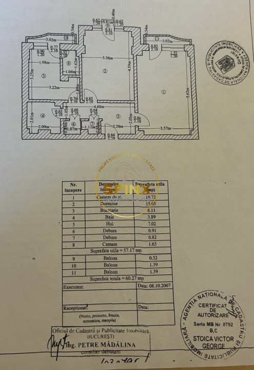 Apartamentul are suprafata utila totala de 60 mp si este format din: living, dormitor, bucatarie, baie, hol, spatii de depozitare si 3 balcoane.