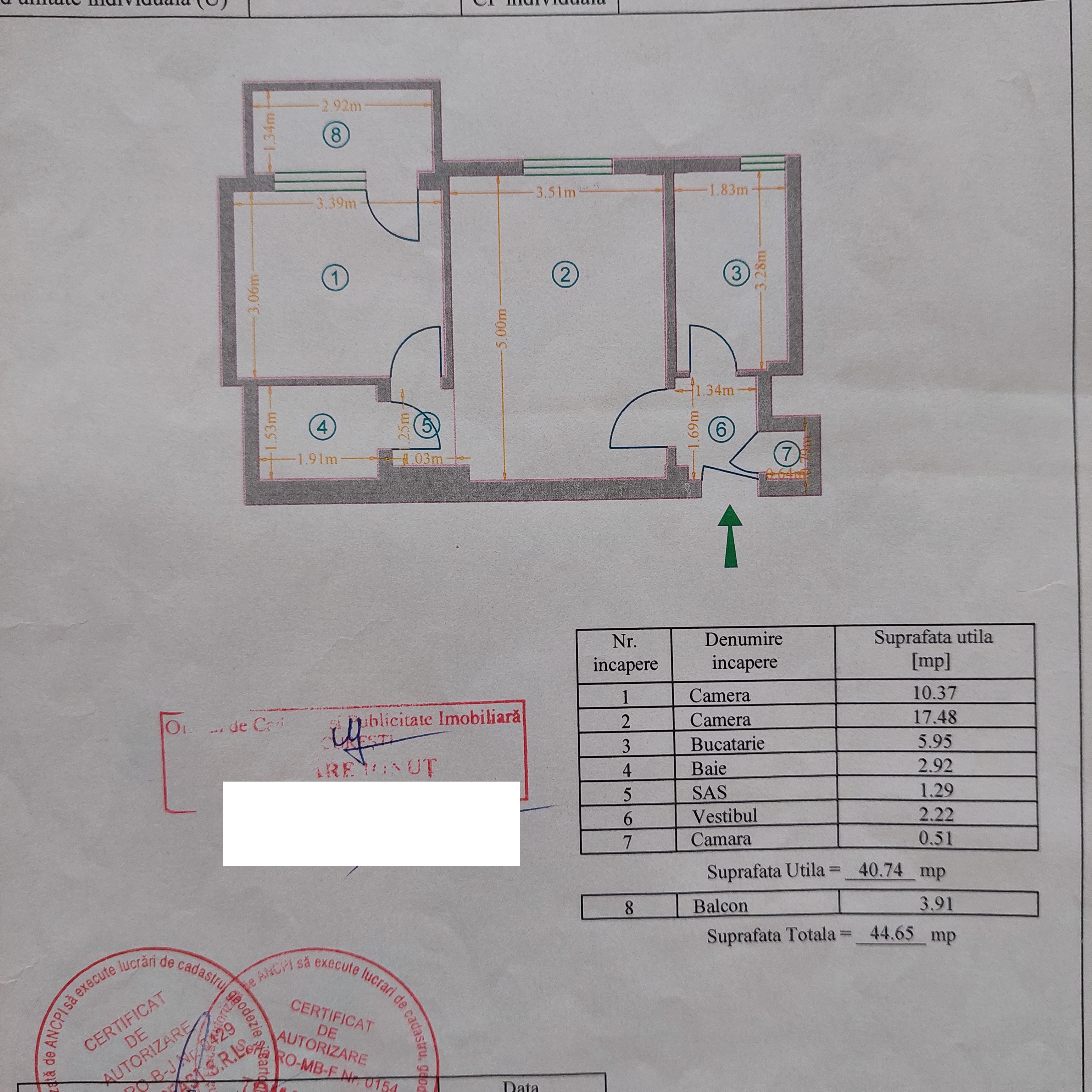 Apartamentul este situat la etajul 4/6, este semidecomandat, cu o suprafata totala de 44.65mp , balcon deschis de 3,91mp iar suprafata utila de 44,74mp.