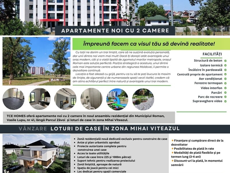 apartamente noi cu 2 camere, moderne si spatioase, in noul ansamblu rezidential din Municipiul Roman, Vasile Lupu, nr. 41, langa Parcul Zavoi.