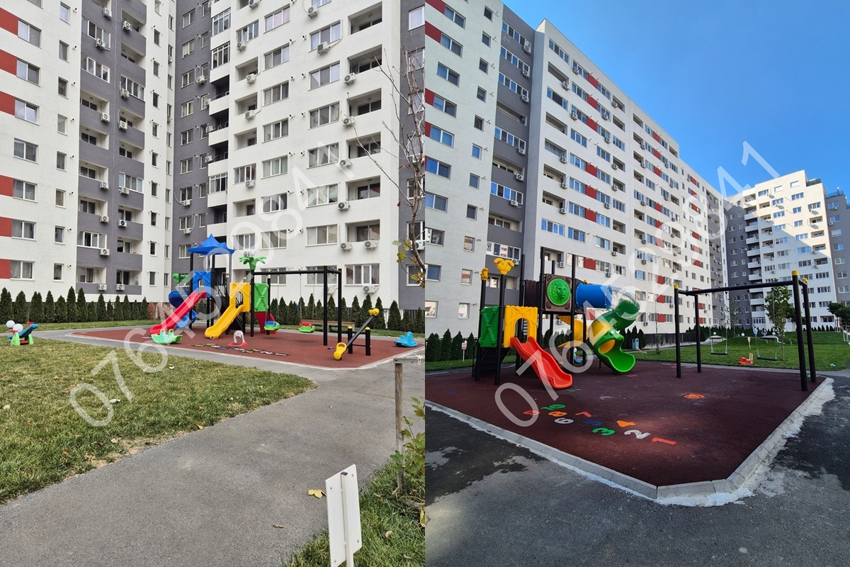 Parc cu alei inverzite in interiorul complexului realizat de arhitecti peisagisti,pomi,bancii,loc de joaca pentru copii cu suprafata tartan ,sistem de irgatie profesional cu aspersoare.