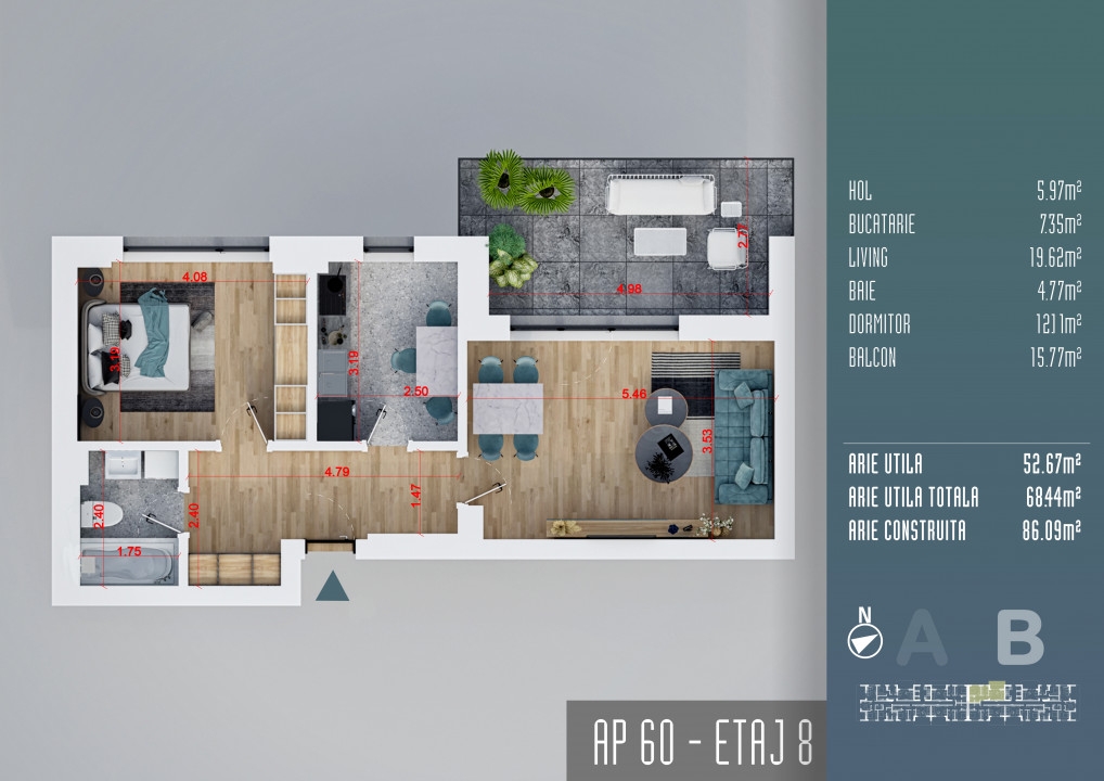 Apartament 2 camere decomandat avand o suprafata utila de 68,44 mp cu o terasa de 15,77 mp,disponibila la etajul 8 , intr-un imobil cu regim de inaltime D+P+11E., avand ca si termen de finalizare Decembrie 2024 si face parte din Proiectul Residential IRAM RESIDENCE si face parte din etapa 2 a proiectului - scara B.