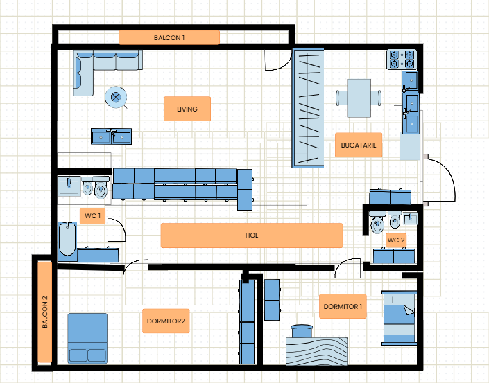 · Compartimentare: Decomandat, 2 dormitoare, living open space cu bucatarie, 2 bai, debara, hol.