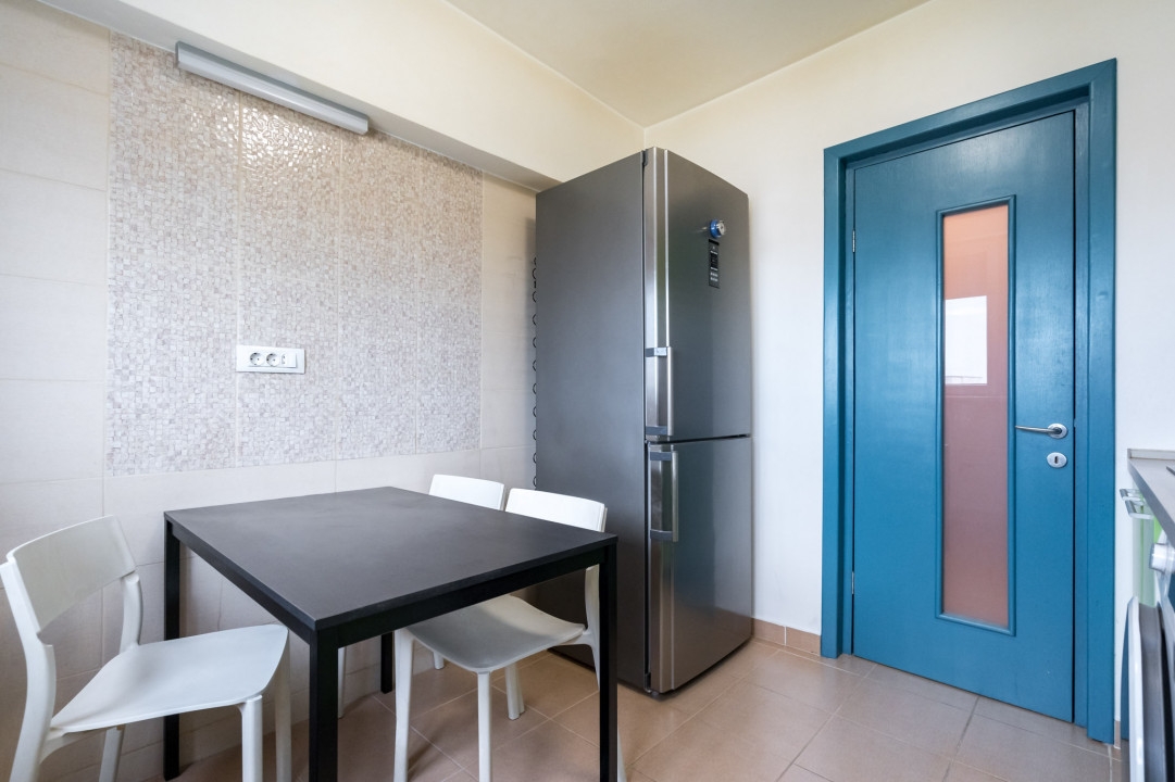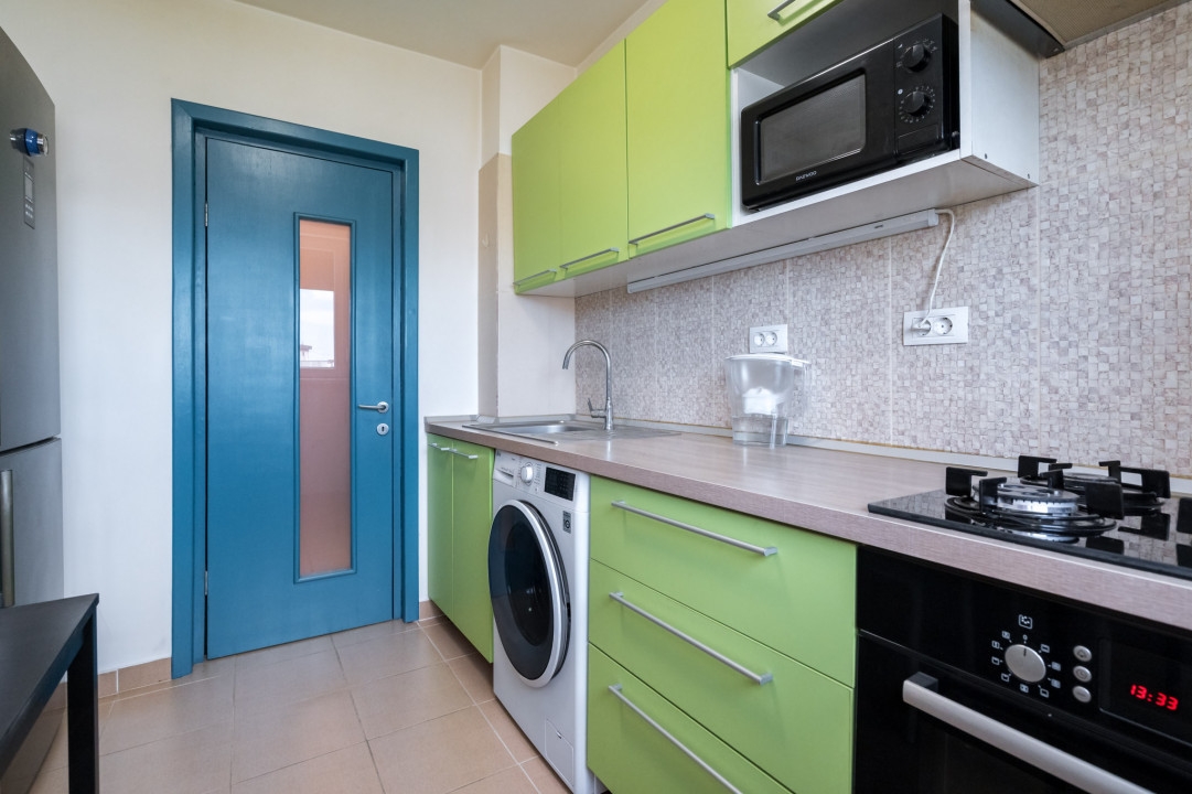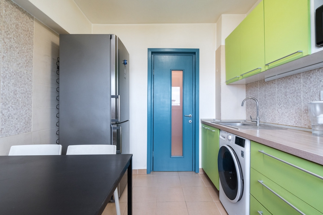 Holul de intrare a fost gandit ca un spatiu de primire, dar si de depozitare, dressingul facut pe comanda fiind foarte incapator. Bucataria este spatioasa si este dotata cu mobilier de calitate facut pe comanda si toate electrocasnicele incorporate. Si ramane asa, mobilata si utilata, ca intreg apartamentul.