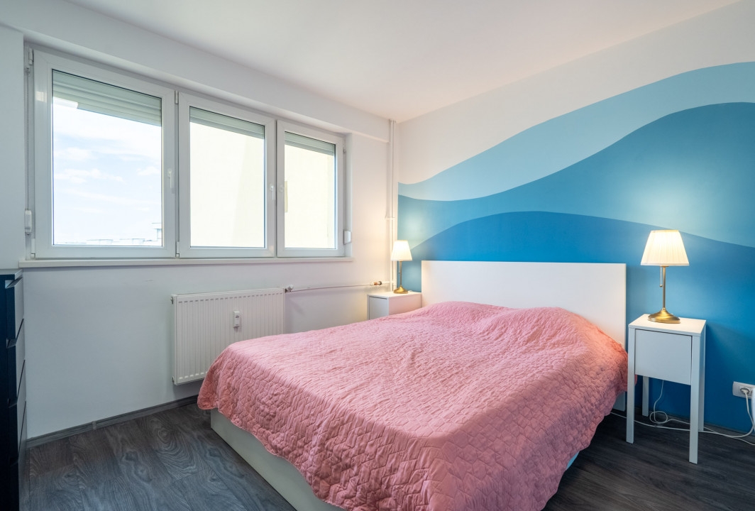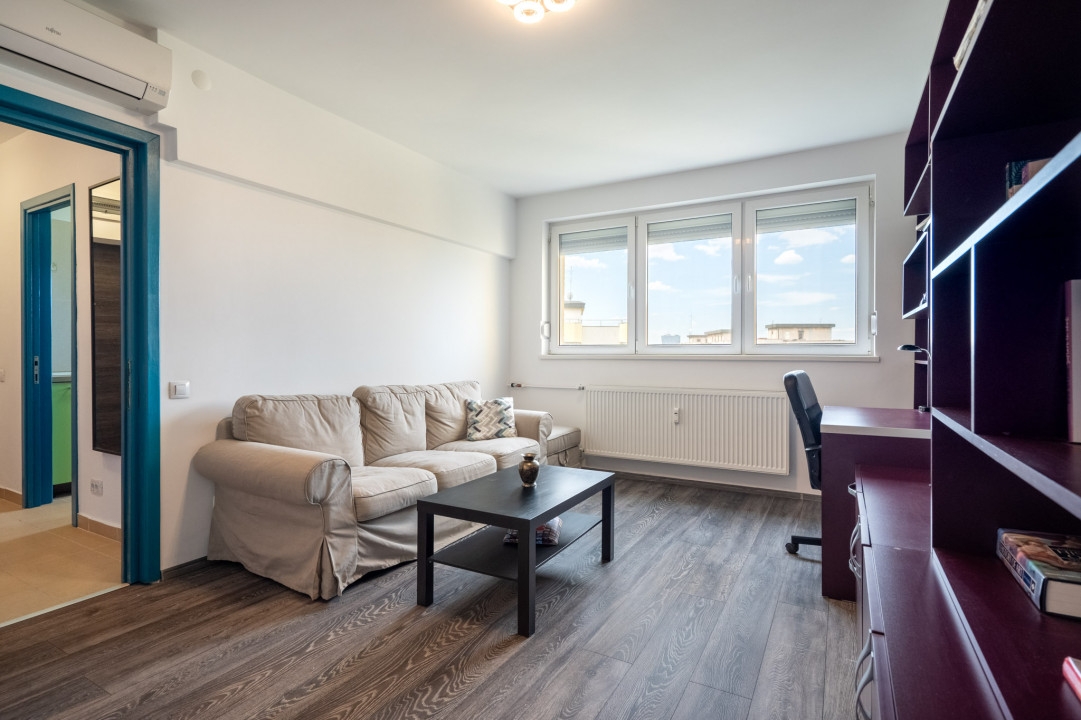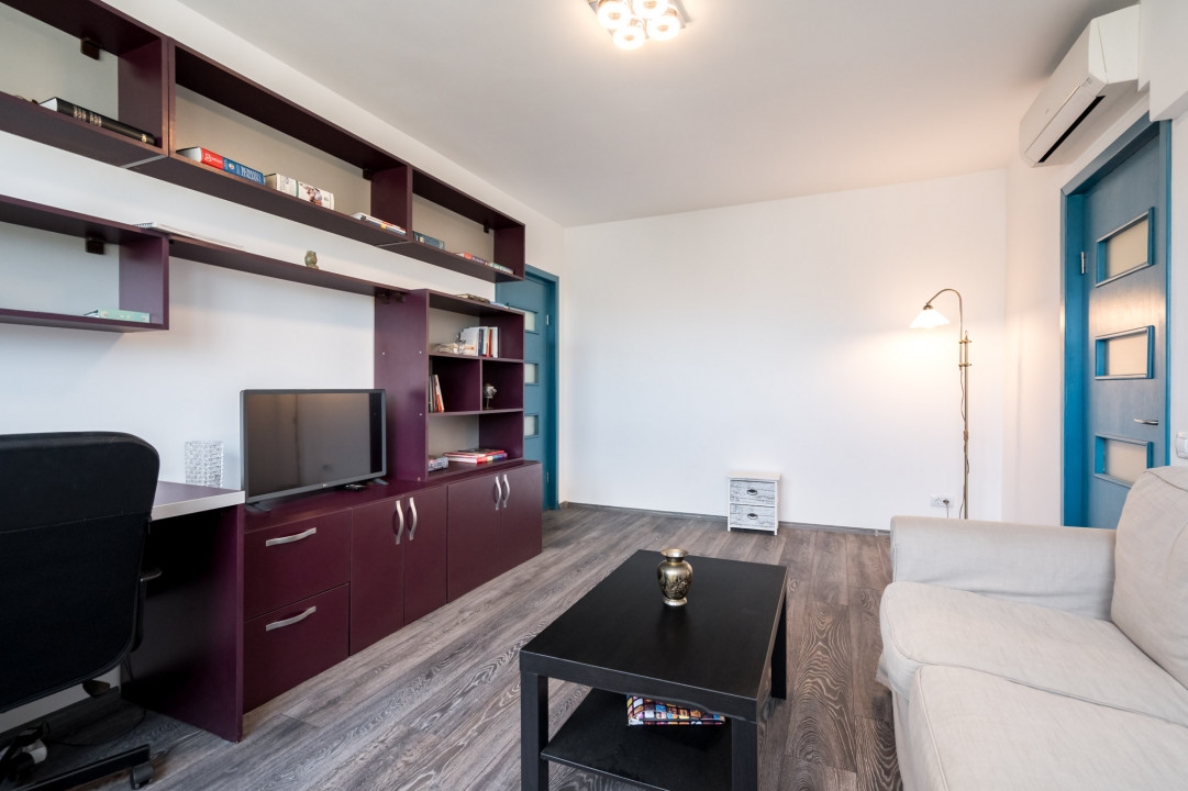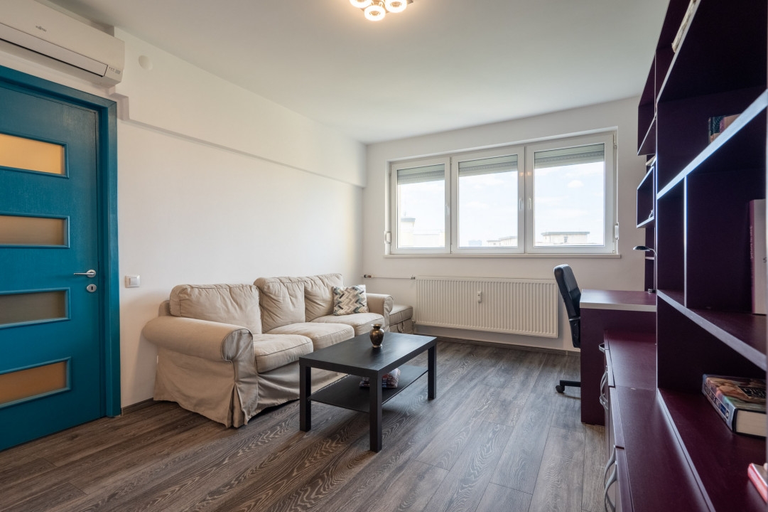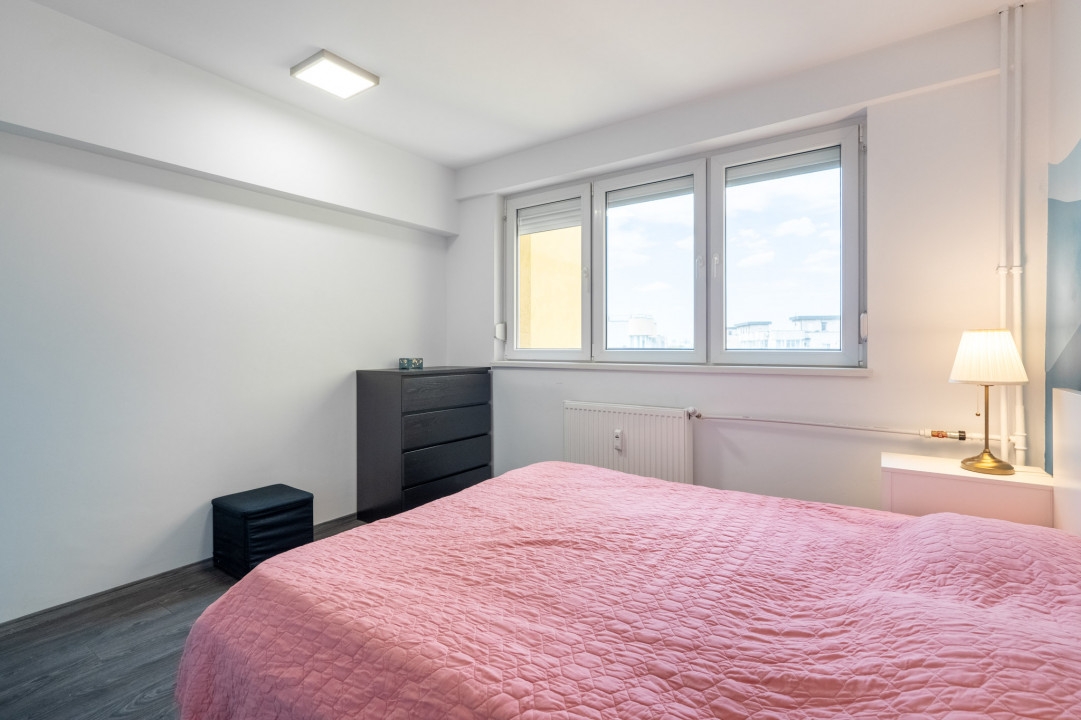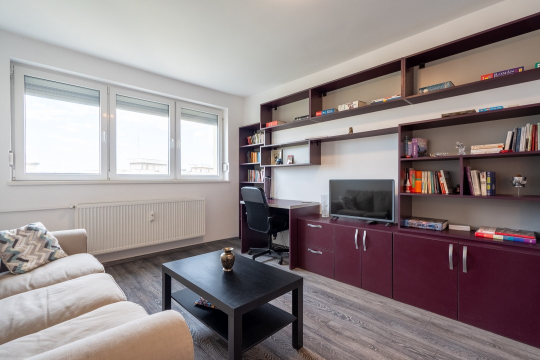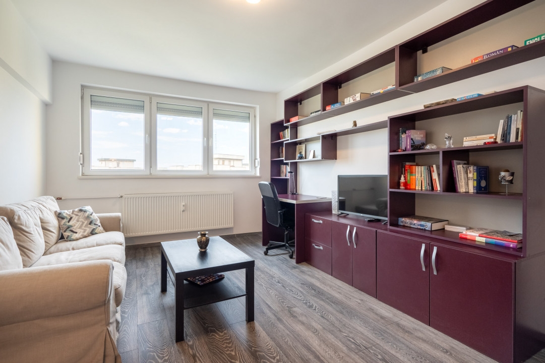 Zona de zi a fost impartita intr-o zona de birou si una de relaxare, televizorul fiind incadrat intr-o biblioteca incapatoare. Cele doua dormitoare sunt bine plasate, in zona de noapte a apartamentului, fiind despartite de sala de baie, complet dotata, cu dus bideu, cu boiler suplimentar instalat si aerisire naturala. Singura camera situata spre bulevard, dormitorul de pe fata, spre Sos Colentina, are balcon, ce este inchis si izolat, tocmai pentru a fi o bariera in plus fata de zgomotul strazii. Avantajul apartamentului este ca se afla la un etaj superior, ceea ce ii confera o vedere neobturata, zgomot redus si multa lumina.